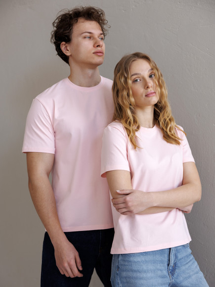 Базові футболки шиємо з тканини кулір для жінок та чоловіків. Тканина не парить, м'яка, дихаюча, гарно тримає форму та не втрачає колір після прання. Футболка має прямий крій та пряме плече. Склад 95% бавовна, 5% еластан