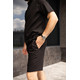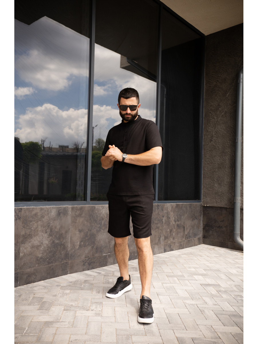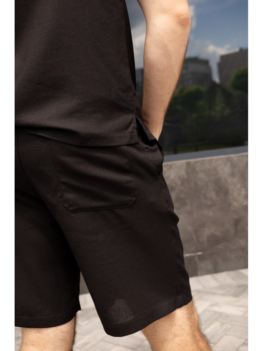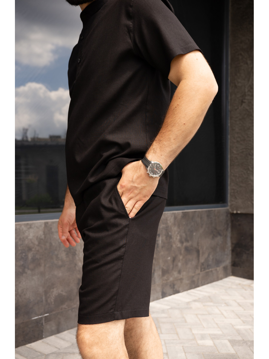 Чоловічий лляний костюм складається з сорочки з коротким рукавом і шортів. Сорочка з горловиною стійкою, застібається на гудзики. Шорти з еластичною резинкою в поясі, яка не перетискає та добре тримається на тілі, мають дві кишені збоку та одну кишеню ззаду. Може бути зі 100% льону або льон штапель/стрейч