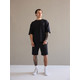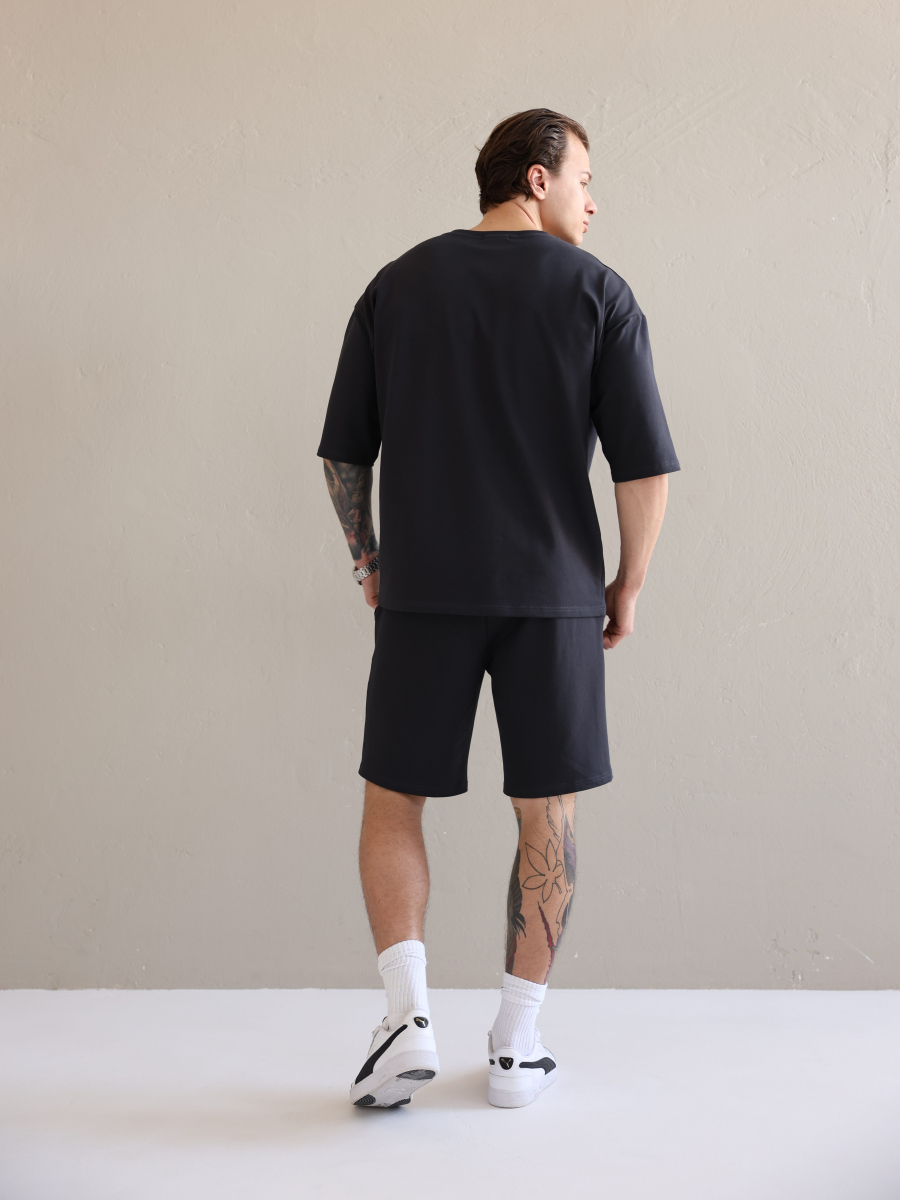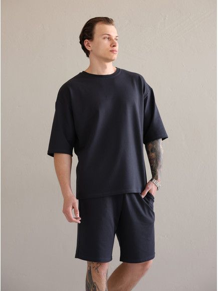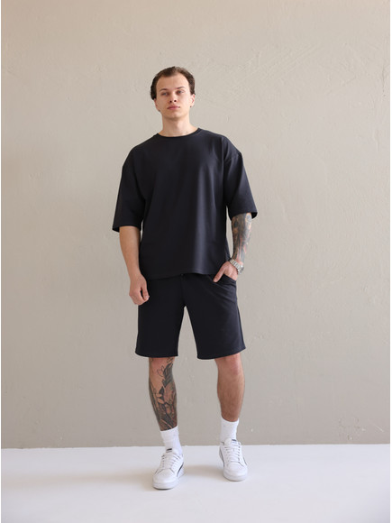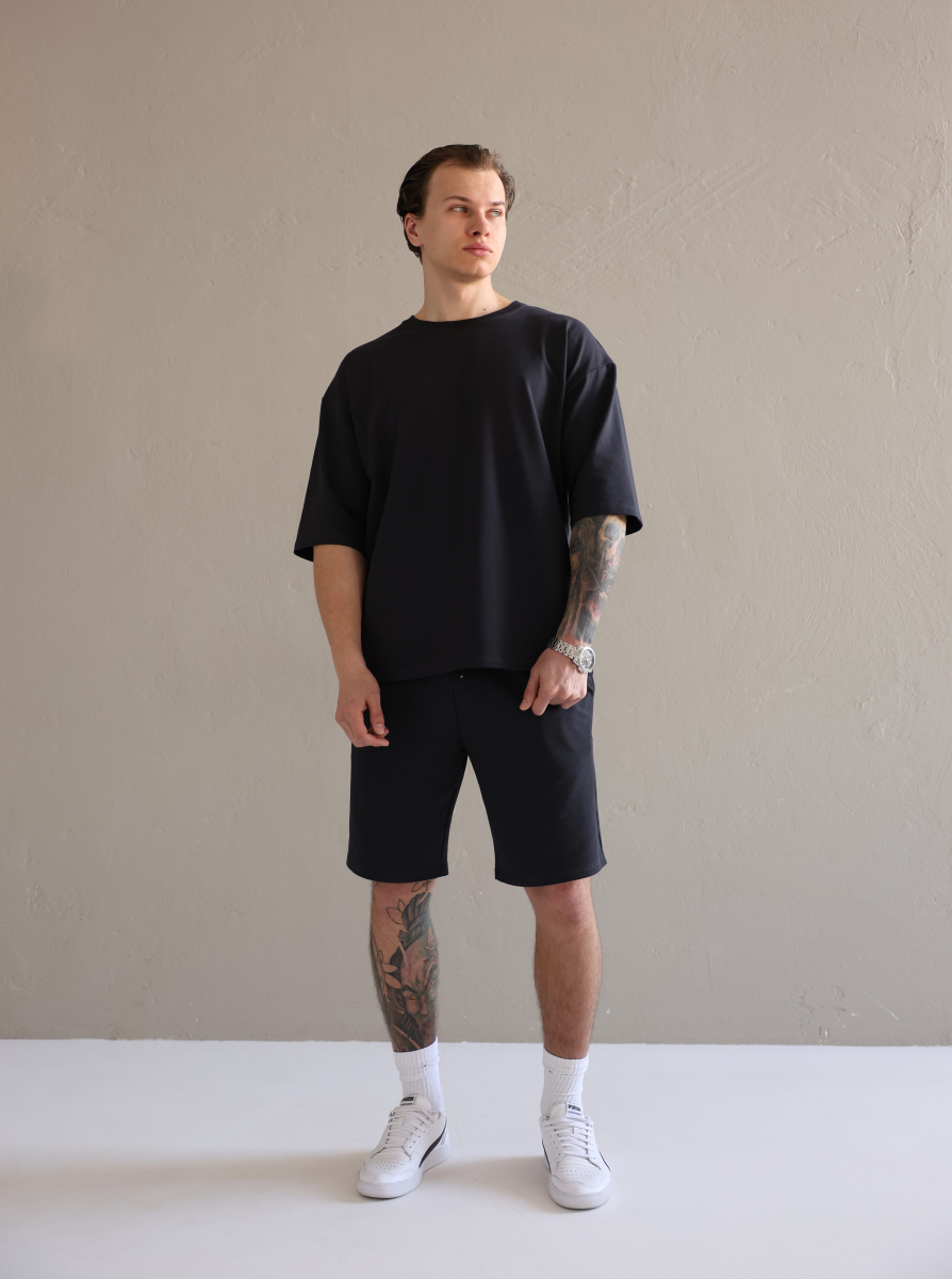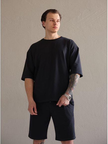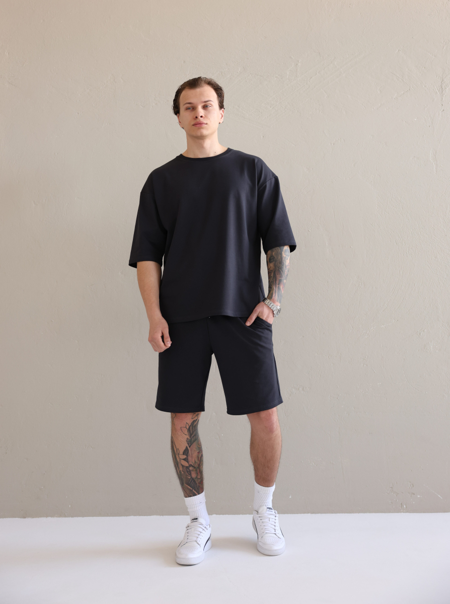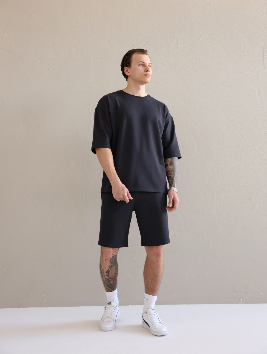 Літній чоловічий костюм «Овершорти». Виконаний з преміальної тканини - двухнитки. Ідеальний варіант на літо, так як тканина дихає, не парить та чудово при цьому виглядає. Футболка вільного крою зі спущеним плечем, подовжена. Не прилягає до тіла, забезпечує комфорт навіть в спеку +30. Шорти високої посадки зі шнурком на поясі, довжини вище коліна. Вільного крою, не прилягають до тіла та не сковують рухів.