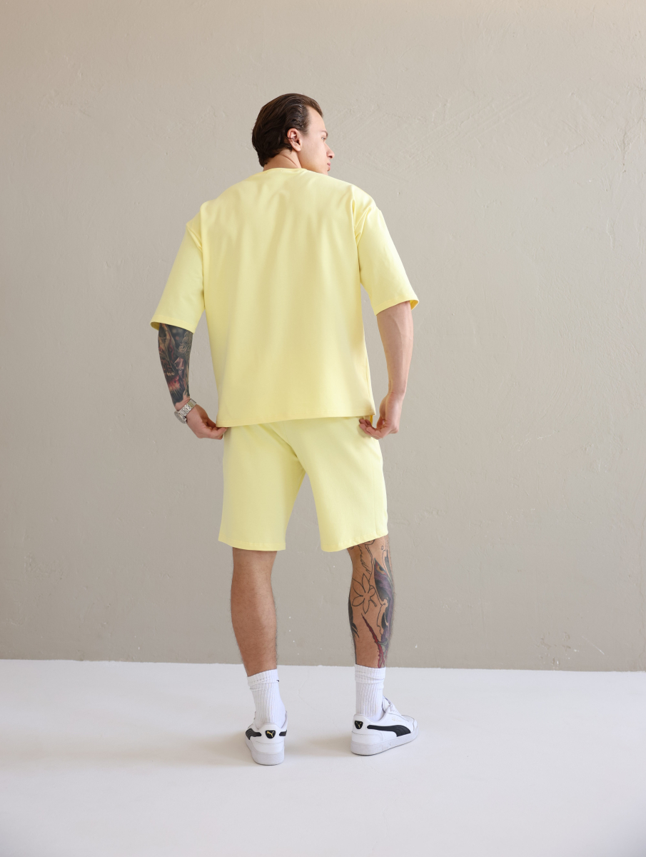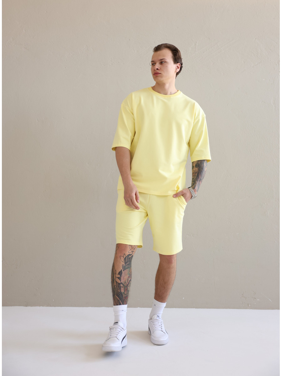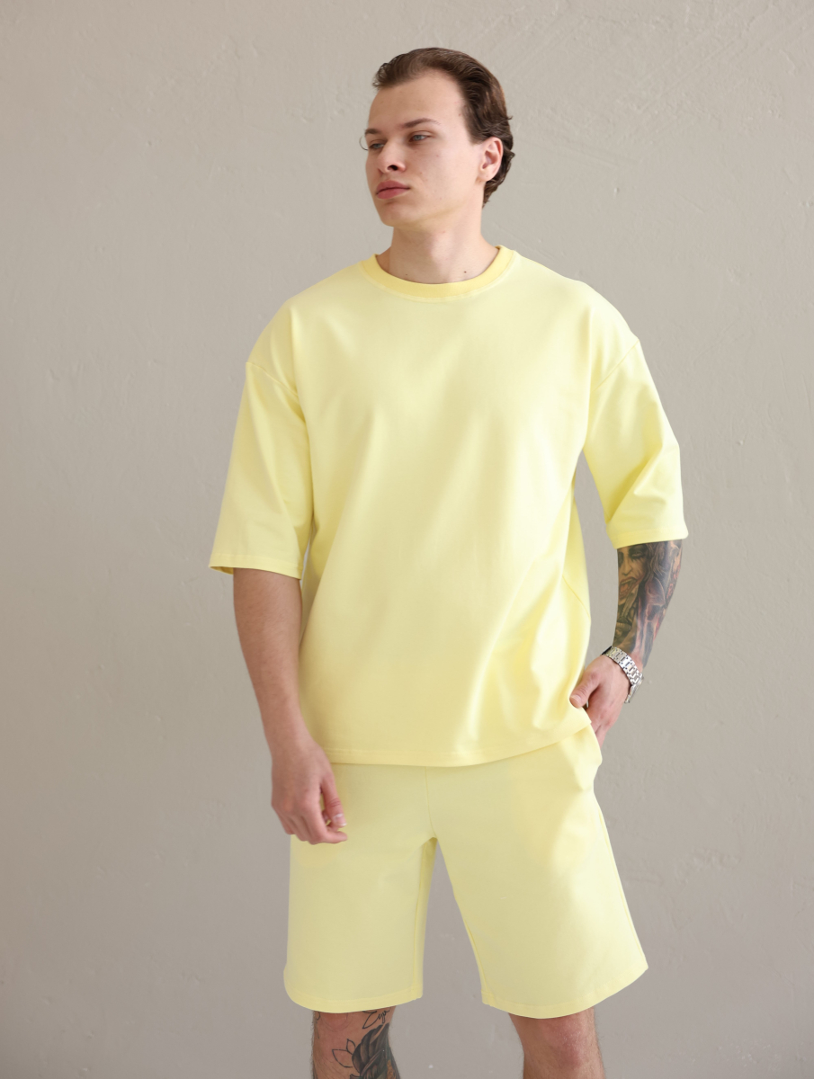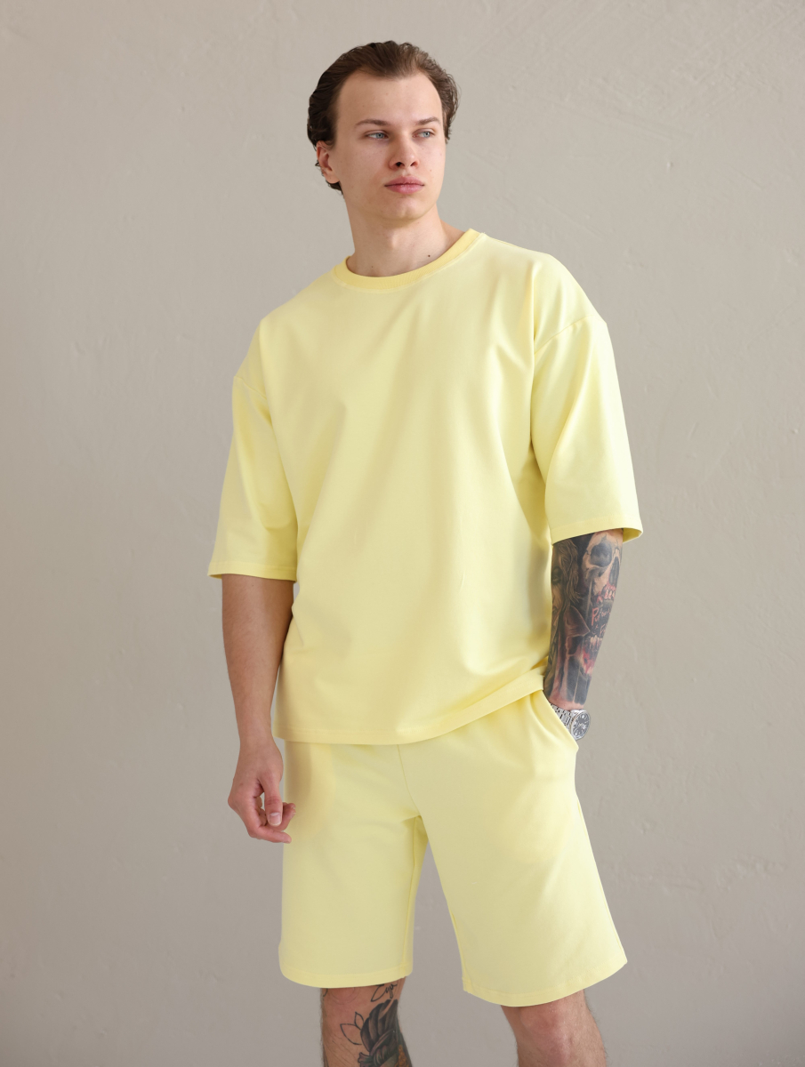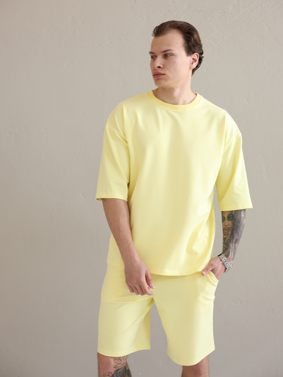 Літній чоловічий костюм «Овершорти». Виконаний з преміальної тканини - двухнитки. Ідеальний варіант на літо, так як тканина дихає, не парить та чудово при цьому виглядає. Футболка вільного крою зі спущеним плечем, подовжена. Не прилягає до тіла, забезпечує комфорт навіть в спеку +30. Шорти високої посадки зі шнурком на поясі, довжини вище коліна. Вільного крою, не прилягають до тіла та не сковують рухів.
