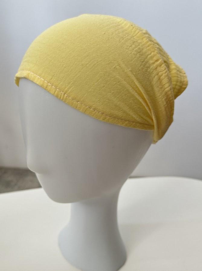 Муслінова косинка, ззаду на резинці. Виготовлена з високоякісного «дихаючого» мусліну преміум сегменту, Тканина легка та приємна до тіла. Забезпечує захист від сонця.
