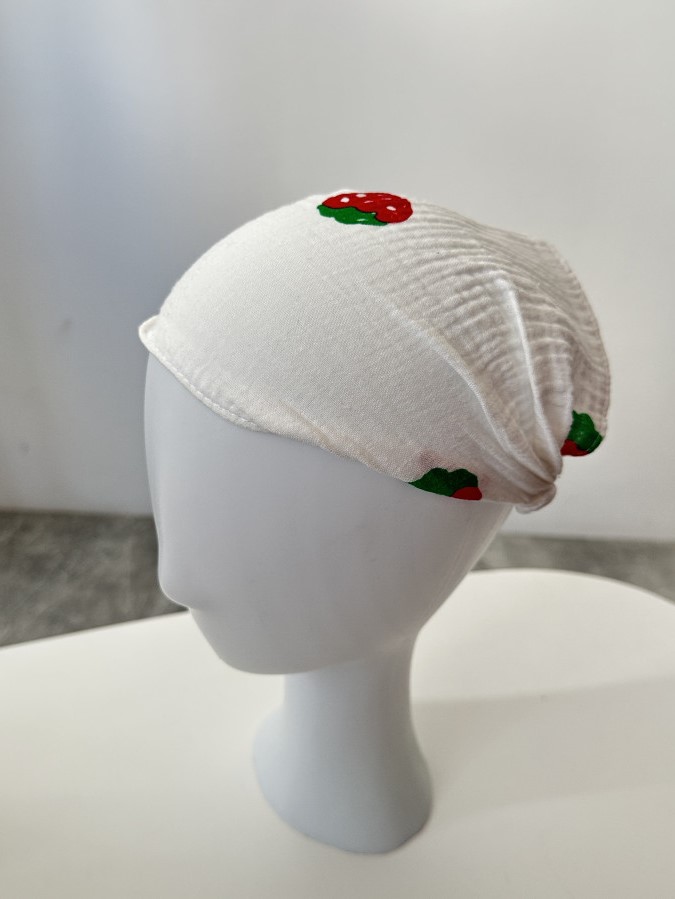 Муслінова косинка, ззаду на резинці. Виготовлена з високоякісного «дихаючого» мусліну преміум сегменту, Тканина легка та приємна до тіла. Забезпечує захист від сонця.