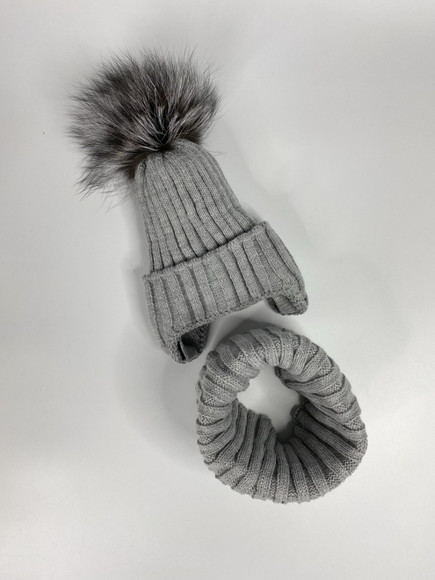 Зимовий набір Барі шапка з натуральним помпоном з в'язки з флісовою підкладкою та снуд з в'язки та флісовою підкладкою. Може бути на окружність голови від 48 до 56 см. Склад в'язки 70% вовна, 30% акріл