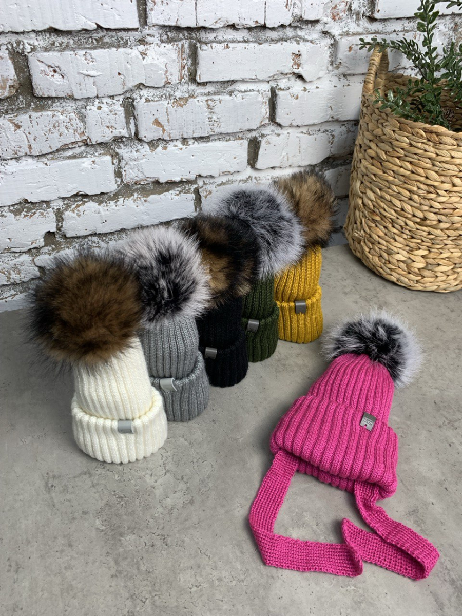 Зимова шапка Отто з натуральним помпоном на кнопціз в'язки з флісовою підкладкою з зав'язками. Може бути на окружність голови від 48 до 54 см. Склад в'язки 70% вовна, 30% акріл