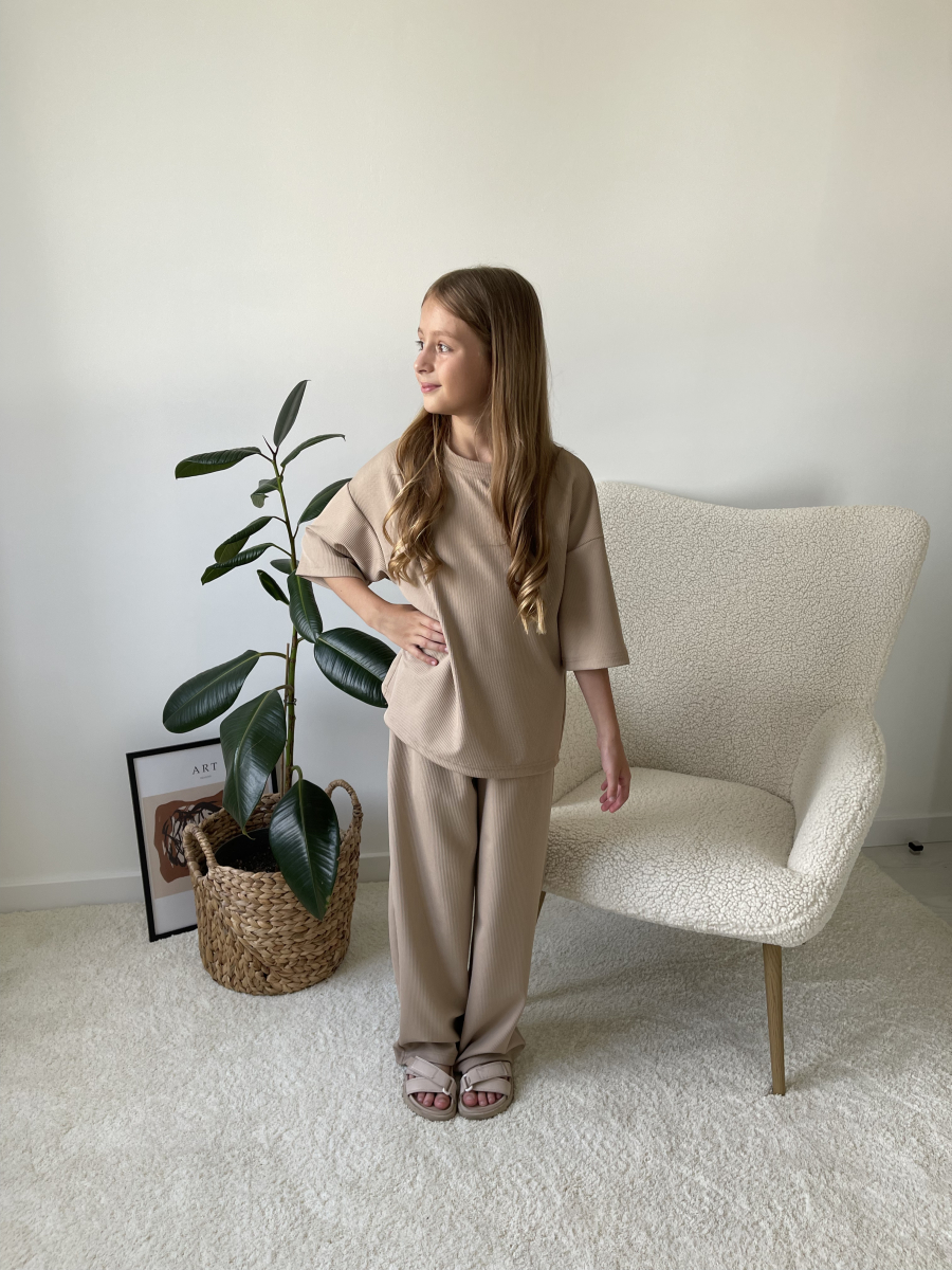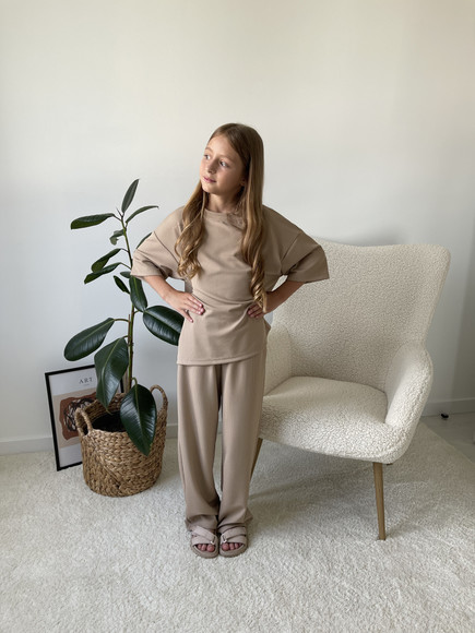 Повсякденний костюм "Кежуал" - футболка вільного крою та штани палаццо. Виконаний з м‘якого «дихаючого» трикотажного матеріалу, який чудово тримає колір та форму. Костюм ніжний до тіла та ідеально підходить на літню пору року. Ще однією перевагою даного костюму є те, що він не мнеться під час носки, і ви завжди будете виглядати ідеально. Футболка вільного крою зі спущеним плечем. Подовжена, не прилягає до тіла , що забезпечує комфорт та свободу руху. Штани «палаццо» високої посадки ідеально комбінуються з будь яким взуттям.