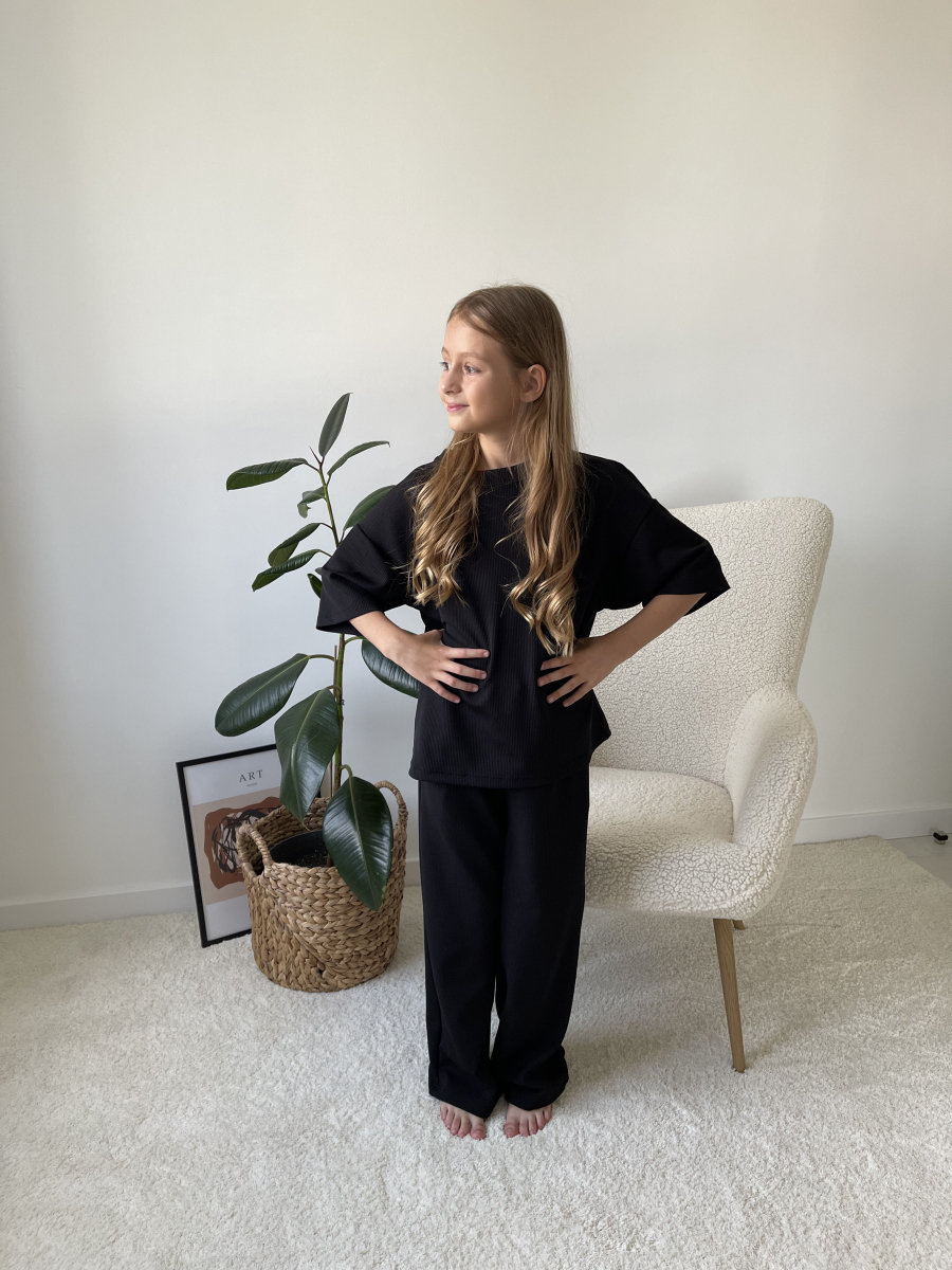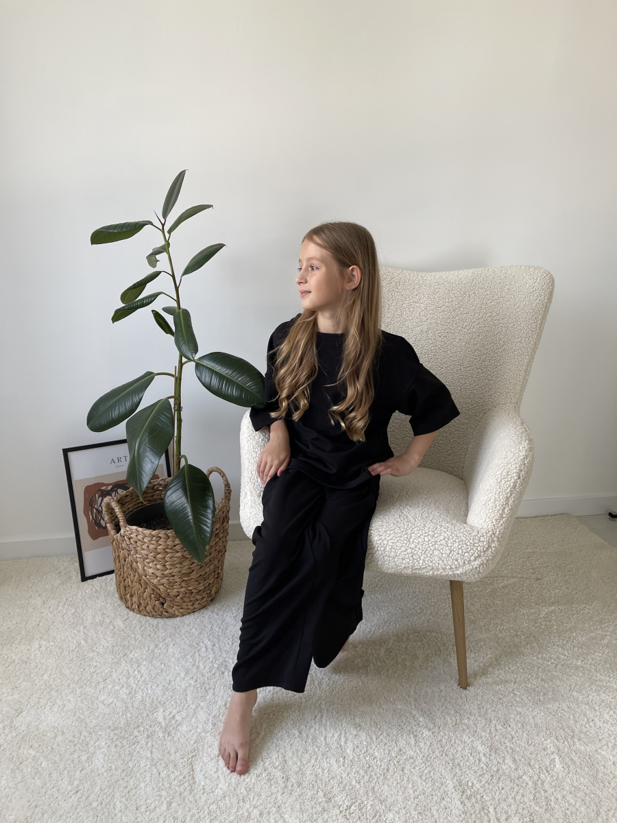 Повсякденний костюм "Кежуал" - футболка вільного крою та штани палаццо. Виконаний з м‘якого «дихаючого» трикотажного матеріалу, який чудово тримає колір та форму. Костюм ніжний до тіла та ідеально підходить на літню пору року. Ще однією перевагою даного костюму є те, що він не мнеться під час носки, і ви завжди будете виглядати ідеально. Футболка вільного крою зі спущеним плечем. Подовжена, не прилягає до тіла , що забезпечує комфорт та свободу руху. Штани «палаццо» високої посадки ідеально комбінуються з будь яким взуттям.