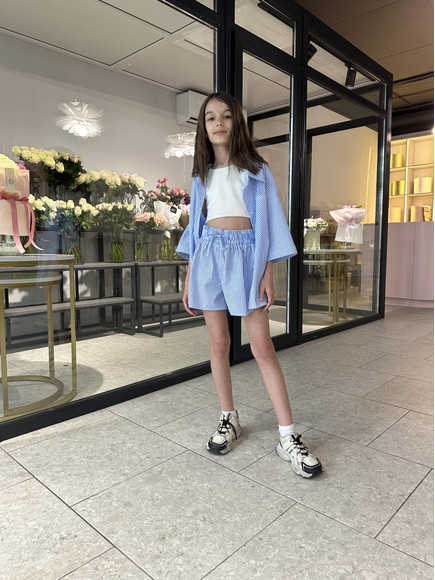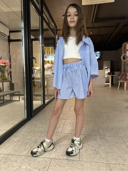 Ніжний та стильний комплект у  смужку — ідеальний вибір для теплої пори року. Складається з вільної сорочки з коротким рукавом і шортів з м’якою резинкою та зав’язками на талії. Легка бавовняна тканина дозволяє тілу дихати, забезпечуючи комфорт навіть у найспекотніші дні. Чудово поєднується з топами чи футболками, як на прогулянку, так і на сімейні вихідні.