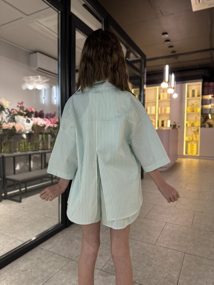 Ніжний та стильний комплект у  смужку — ідеальний вибір для теплої пори року. Складається з вільної сорочки з коротким рукавом і шортів з м’якою резинкою та зав’язками на талії. Легка бавовняна тканина дозволяє тілу дихати, забезпечуючи комфорт навіть у найспекотніші дні. Чудово поєднується з топами чи футболками, як на прогулянку, так і на сімейні вихідні.