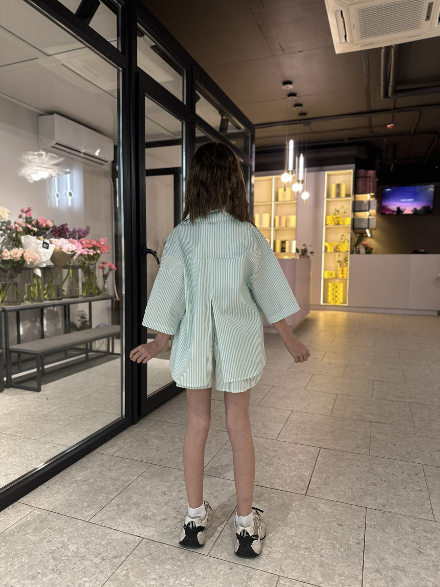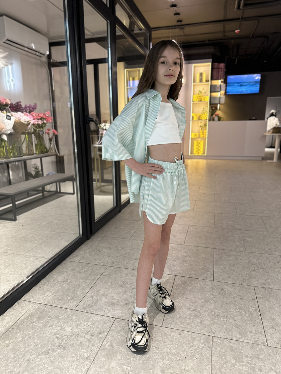 Ніжний та стильний комплект у  смужку — ідеальний вибір для теплої пори року. Складається з вільної сорочки з коротким рукавом і шортів з м’якою резинкою та зав’язками на талії. Легка бавовняна тканина дозволяє тілу дихати, забезпечуючи комфорт навіть у найспекотніші дні. Чудово поєднується з топами чи футболками, як на прогулянку, так і на сімейні вихідні.