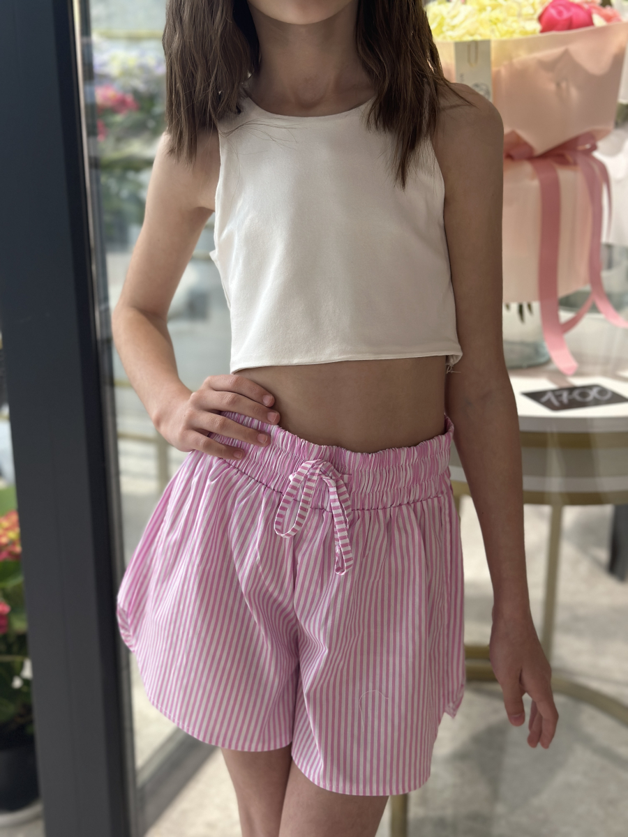 Ніжний та стильний комплект у  смужку — ідеальний вибір для теплої пори року. Складається з вільної сорочки з коротким рукавом і шортів з м’якою резинкою та зав’язками на талії. Легка бавовняна тканина дозволяє тілу дихати, забезпечуючи комфорт навіть у найспекотніші дні. Чудово поєднується з топами чи футболками, як на прогулянку, так і на сімейні вихідні.