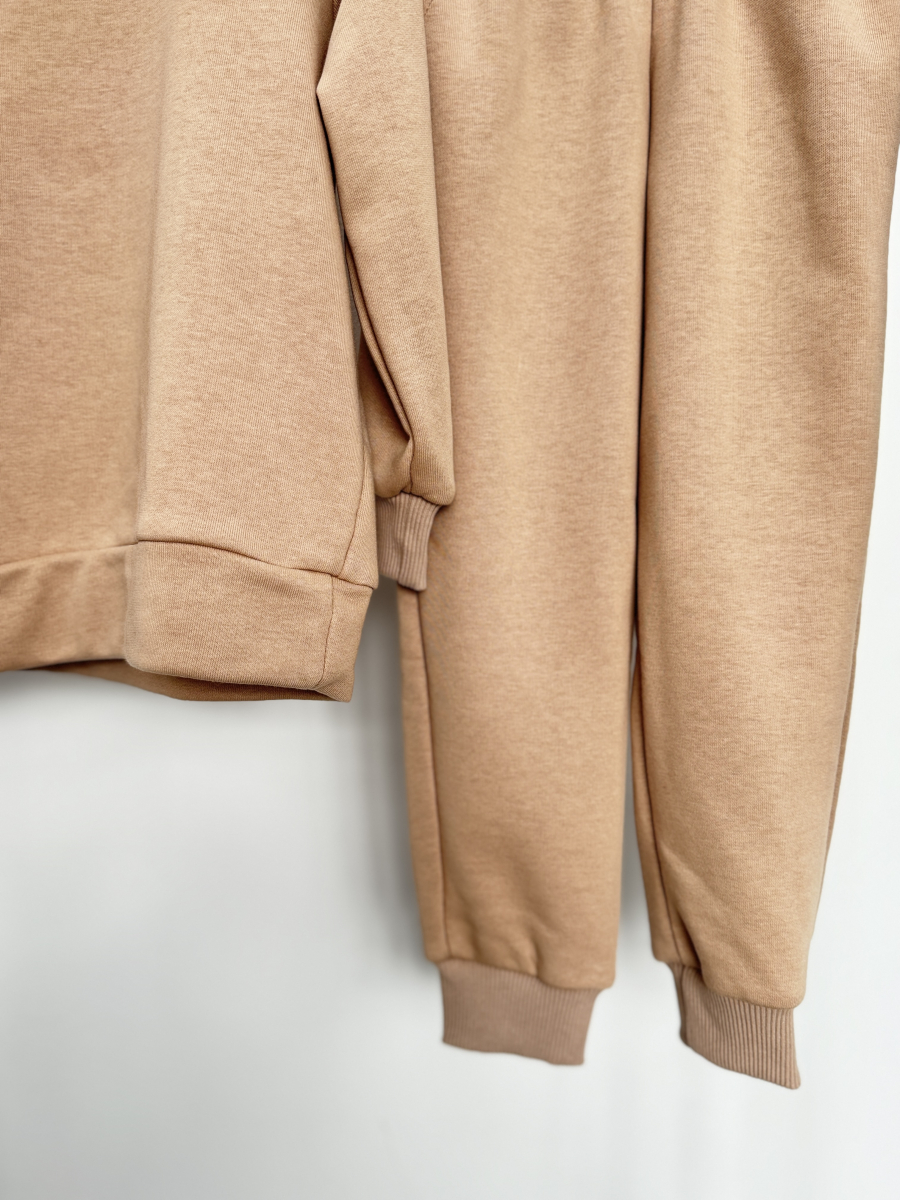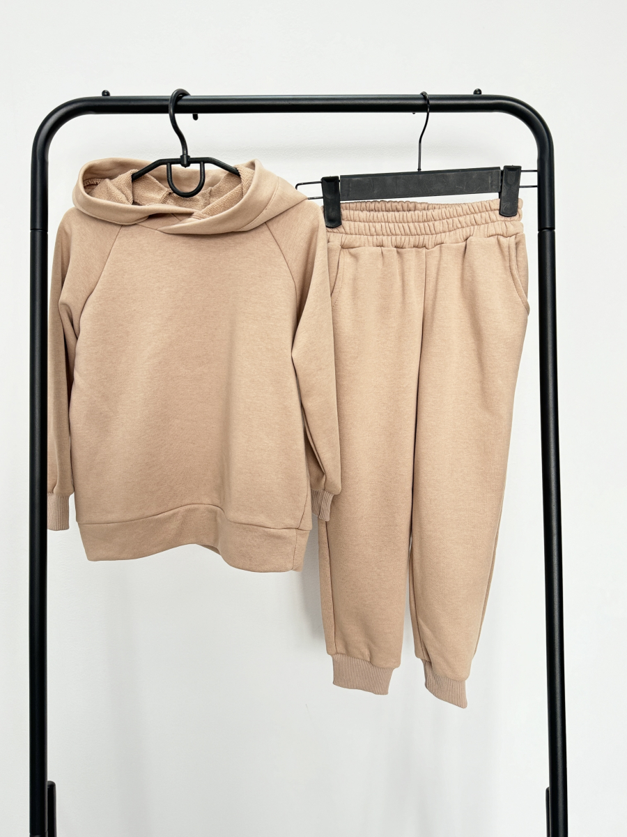 Костюм відшиваємо з тканини трьохнитки петлі (демі варіант) з покриттям Soft Touch, завдяки якому тканина не кошлатиться - для жінок, чоловіків та дітей. Модель складається з худі з капюшоном, капюшон глибокий та спереді кишеня (рукав реглан) + джогери, в джогерах є кишені збоку. Рукава та джогери йдуть на манжетах з рібани, які забезпечують ідеальну посадку, а низ кофти - з основи тканини