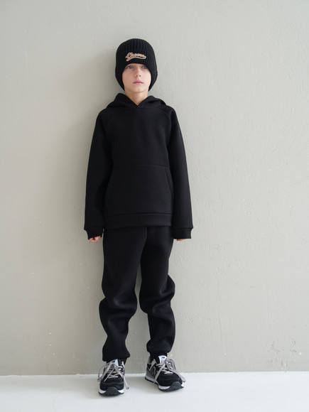 Стильний костюм виконаний зі щільної преміальної тканини з начісом, який гарантує тепло та комфорт у холодну пору. Особливістю моделі для дорослих є подвійний капюшон для додаткового затишку, тоді як дитячий варіант має одинарний капюшон. Манжети рукавів та штанів виконані із м'якого матеріалу - рібани, що забезпечує ідеальну посадку.