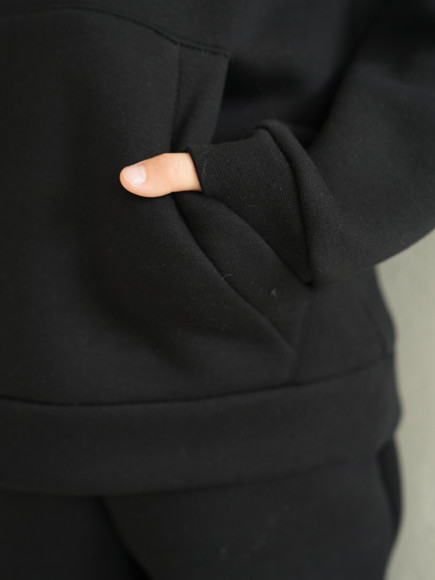 Стильний костюм виконаний зі щільної преміальної тканини з начісом, який гарантує тепло та комфорт у холодну пору. Особливістю моделі для дорослих є подвійний капюшон для додаткового затишку, тоді як дитячий варіант має одинарний капюшон. Манжети рукавів та штанів виконані із м'якого матеріалу - рібани, що забезпечує ідеальну посадку.