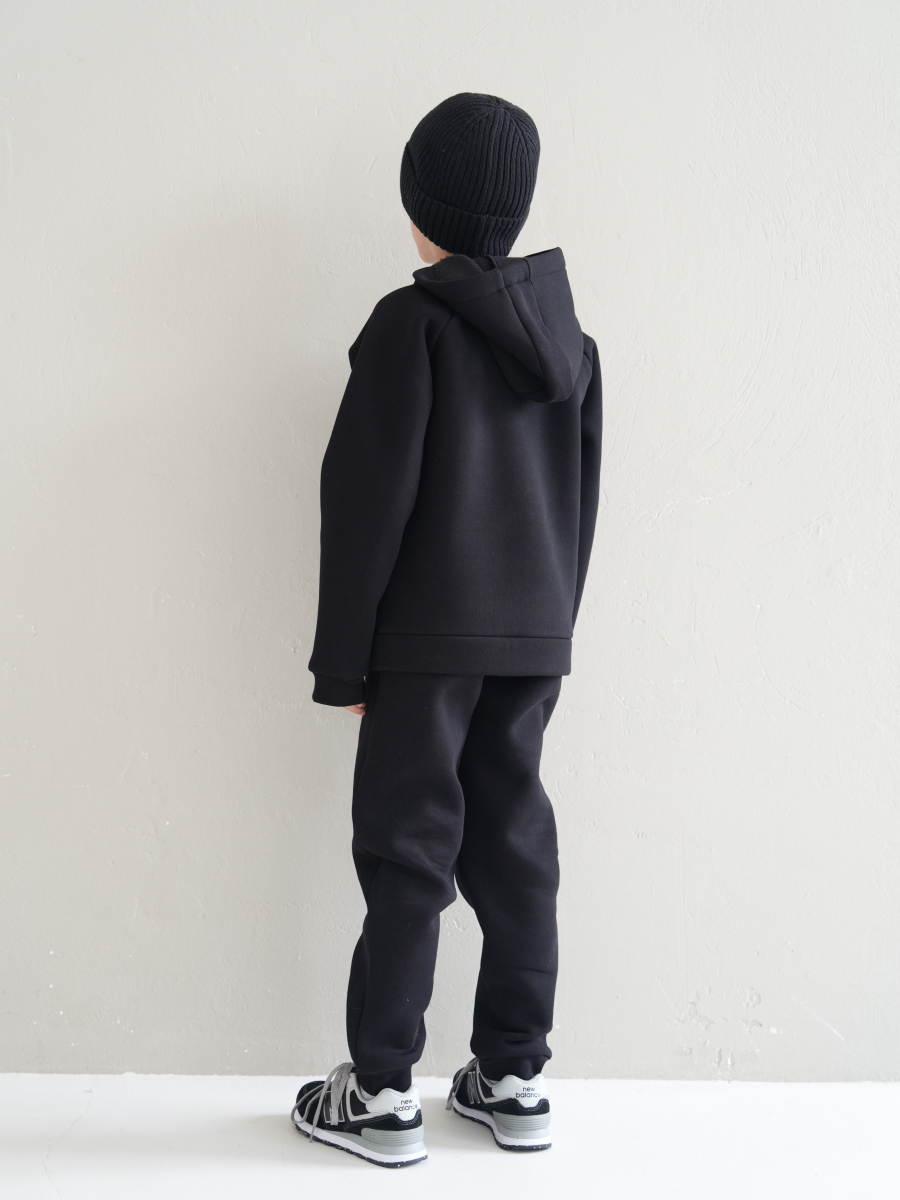 Стильний костюм виконаний зі щільної преміальної тканини з начісом, який гарантує тепло та комфорт у холодну пору. Особливістю моделі для дорослих є подвійний капюшон для додаткового затишку, тоді як дитячий варіант має одинарний капюшон. Манжети рукавів та штанів виконані із м'якого матеріалу - рібани, що забезпечує ідеальну посадку.