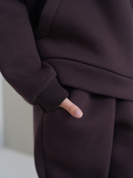 Стильний костюм виконаний зі щільної преміальної тканини з начісом, який гарантує тепло та комфорт у холодну пору. Особливістю моделі для дорослих є подвійний капюшон для додаткового затишку, тоді як дитячий варіант має одинарний капюшон. Манжети рукавів та штанів виконані із м'якого матеріалу - рібани, що забезпечує ідеальну посадку.