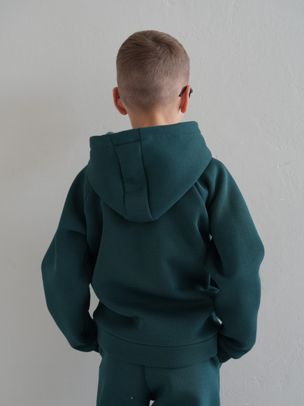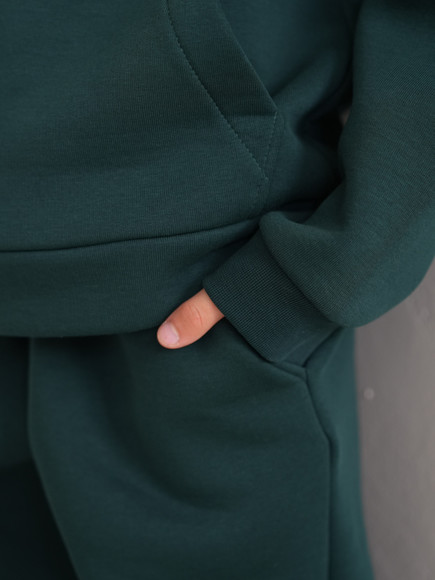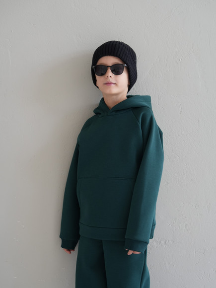 Стильний костюм виконаний зі щільної преміальної тканини з начісом, який гарантує тепло та комфорт у холодну пору. Особливістю моделі для дорослих є подвійний капюшон для додаткового затишку, тоді як дитячий варіант має одинарний капюшон. Манжети рукавів та штанів виконані із м'якого матеріалу - рібани, що забезпечує ідеальну посадку.