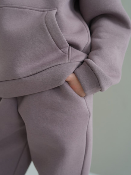 Стильний костюм виконаний зі щільної преміальної тканини з начісом, який гарантує тепло та комфорт у холодну пору. Особливістю моделі для дорослих є подвійний капюшон для додаткового затишку, тоді як дитячий варіант має одинарний капюшон. Манжети рукавів та штанів виконані із м'якого матеріалу - рібани, що забезпечує ідеальну посадку.