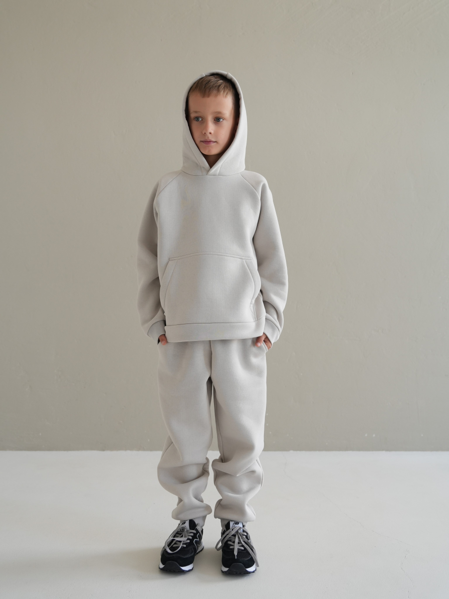Стильний костюм виконаний зі щільної преміальної тканини з начісом, який гарантує тепло та комфорт у холодну пору. Особливістю моделі для дорослих є подвійний капюшон для додаткового затишку, тоді як дитячий варіант має одинарний капюшон. Манжети рукавів та штанів виконані із м'якого матеріалу - рібани, що забезпечує ідеальну посадку.