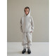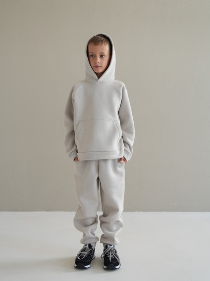 Стильний костюм виконаний зі щільної преміальної тканини з начісом, який гарантує тепло та комфорт у холодну пору. Особливістю моделі для дорослих є подвійний капюшон для додаткового затишку, тоді як дитячий варіант має одинарний капюшон. Манжети рукавів та штанів виконані із м'якого матеріалу - рібани, що забезпечує ідеальну посадку.