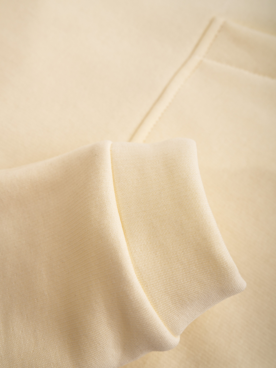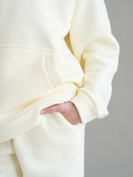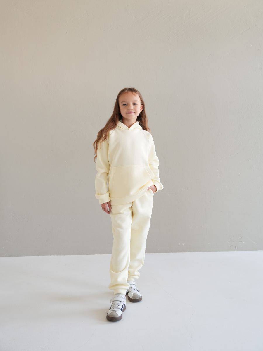 Стильний костюм виконаний зі щільної преміальної тканини з начісом, який гарантує тепло та комфорт у холодну пору. Особливістю моделі для дорослих є подвійний капюшон для додаткового затишку, тоді як дитячий варіант має одинарний капюшон. Манжети рукавів та штанів виконані із м'якого матеріалу - рібани, що забезпечує ідеальну посадку.