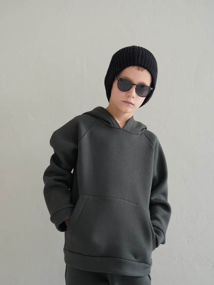 Стильний костюм виконаний зі щільної преміальної тканини з начісом, який гарантує тепло та комфорт у холодну пору. Особливістю моделі для дорослих є подвійний капюшон для додаткового затишку, тоді як дитячий варіант має одинарний капюшон. Манжети рукавів та штанів виконані із м'якого матеріалу - рібани, що забезпечує ідеальну посадку.