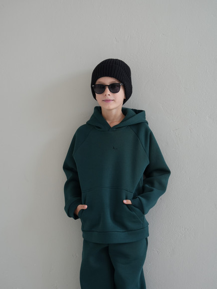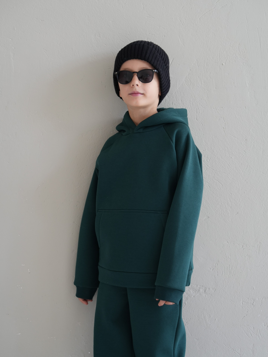 Стильний костюм виконаний зі щільної преміальної тканини з начісом, який гарантує тепло та комфорт у холодну пору. Особливістю моделі для дорослих є подвійний капюшон для додаткового затишку, тоді як дитячий варіант має одинарний капюшон. Манжети рукавів та штанів виконані із м'якого матеріалу - рібани, що забезпечує ідеальну посадку.