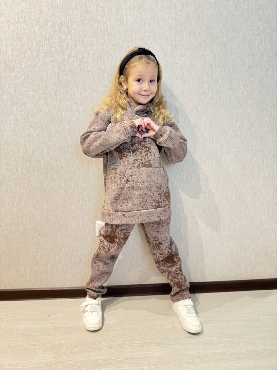 Стильний костюм виконаний зі щільної преміальної тканини з начісом, який гарантує тепло та комфорт у холодну пору. Особливістю моделі для дорослих є подвійний капюшон для додаткового затишку, тоді як дитячий варіант має одинарний капюшон. Манжети рукавів та штанів виконані із м'якого матеріалу - рібани, що забезпечує ідеальну посадку.