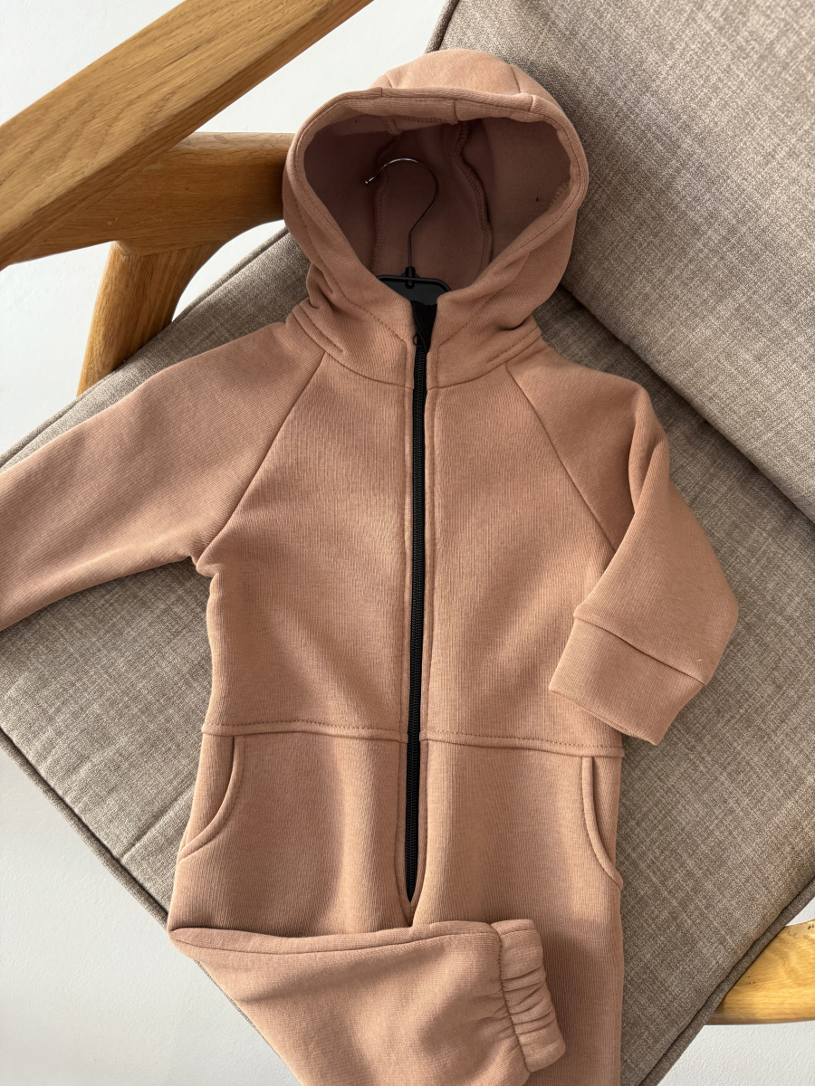Дитячий утеплений комбінезон «Ромпер» з капюшоном. Модель для діток в розмірах від 74 см до 158 см виконана із високоякісного бавовняного начосу, який забезпечує тепло та комфорт під час носіння завдяки «дихаючій» тканині, яка не втрачає форму та колір після прання. Ромпер з застібкою-блискавкою, кишенями для зручності та резинкою на спинці.