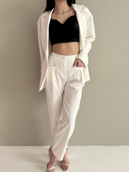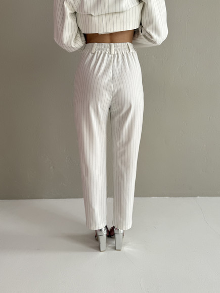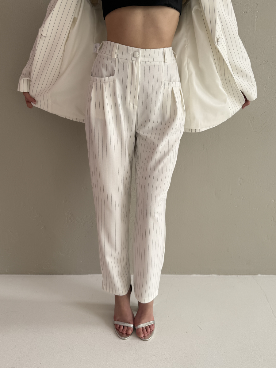 Стильні штани у смужку з костюмної тканини — поєднання елегантності та комфорту. Завдяки защіпам на талії вони створюють ідеальну посадку, підкреслюючи силует і додаючи образу вишуканості. Носіть зі жакетом для бездоганного класичного ансамблю або поєднуйте з базовим топом для розслабленого, але стильного вигляду.