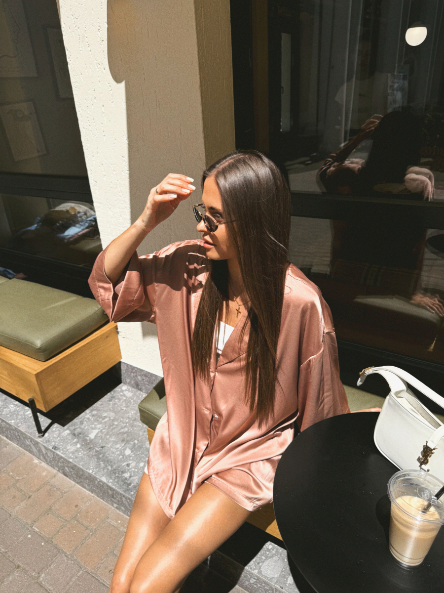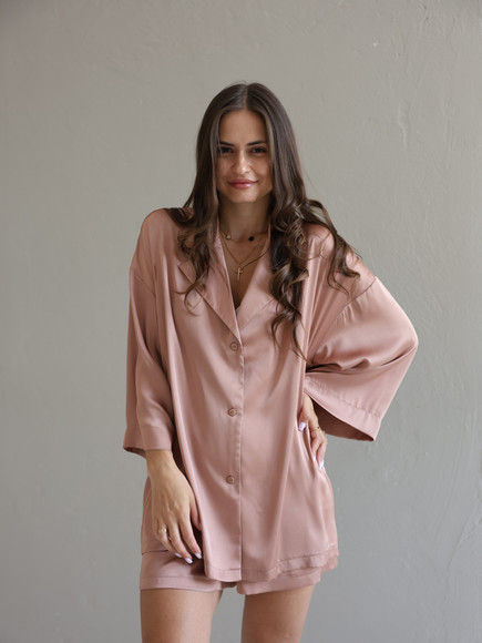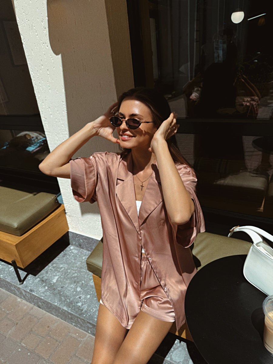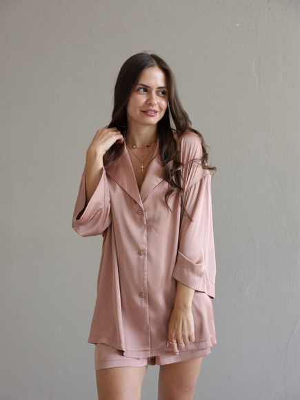 Домашній костюм із преміальної тканини шовк арміні - це поєднання елегантності, комфорту та витонченого стилю. Легка, гладка та приємна до тіла тканина ніжно огортає шкіру, даруючи відчуття розкоші навіть у домашній атмосфері. Сорочка вільного крою створює невимушений силует, а шорти з комфортною посадкою забезпечують максимальну свободу рухів.