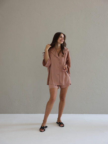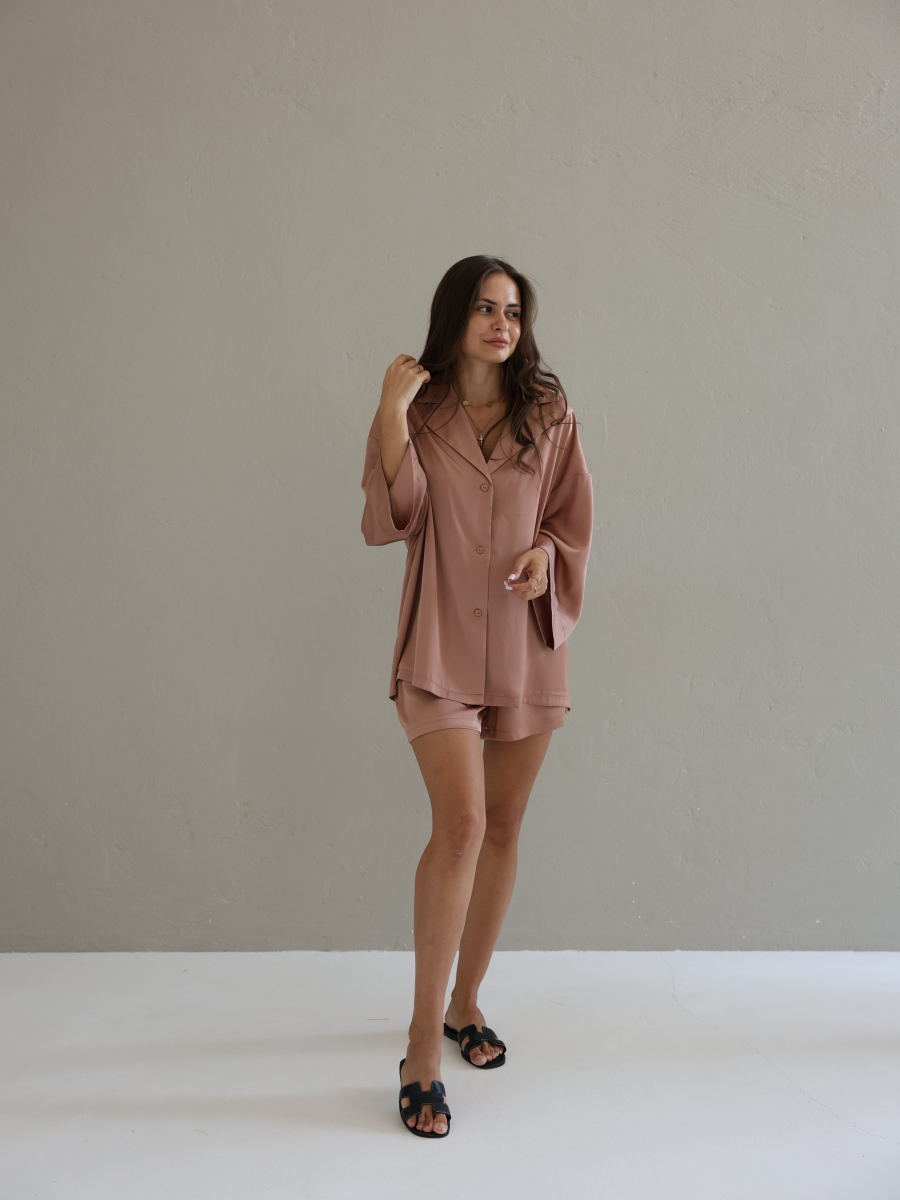 Домашній костюм із преміальної тканини шовк арміні - це поєднання елегантності, комфорту та витонченого стилю. Легка, гладка та приємна до тіла тканина ніжно огортає шкіру, даруючи відчуття розкоші навіть у домашній атмосфері. Сорочка вільного крою створює невимушений силует, а шорти з комфортною посадкою забезпечують максимальну свободу рухів.