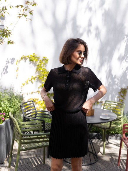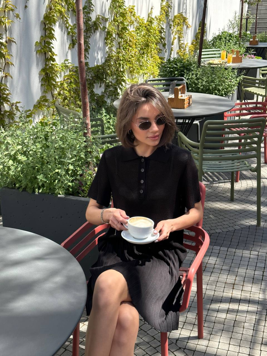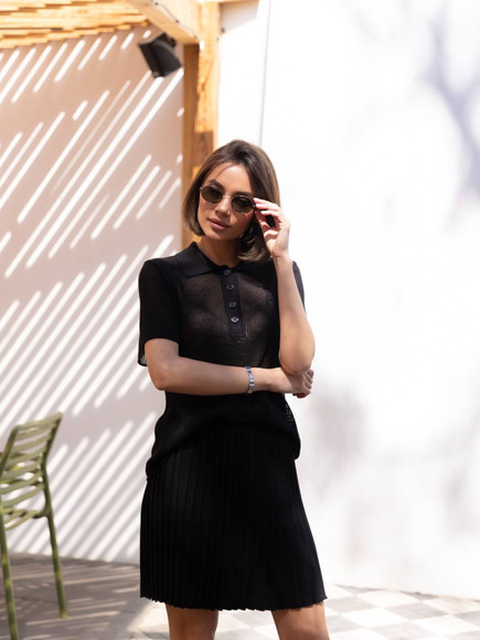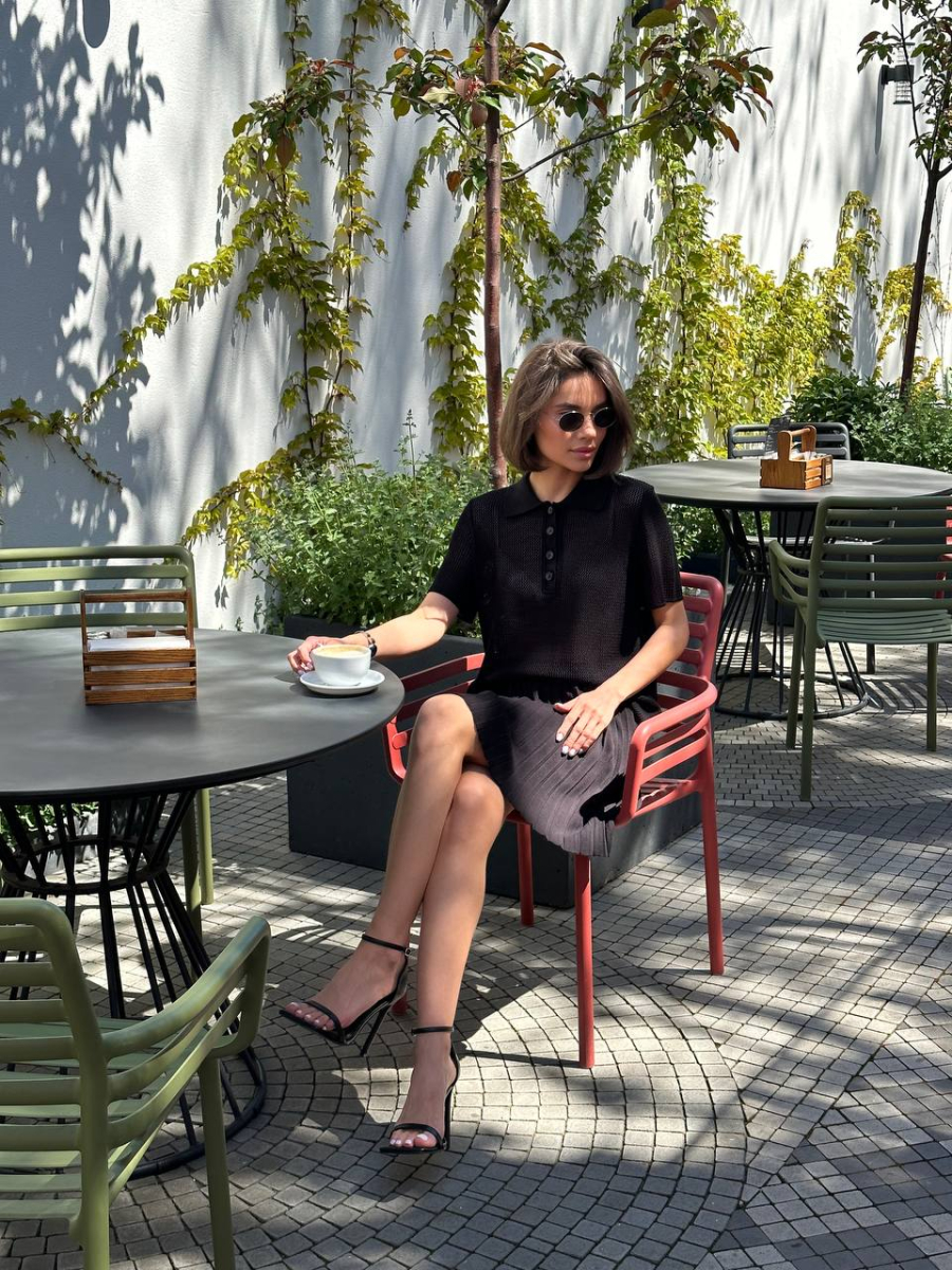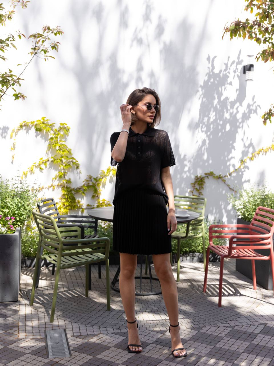 Стильний в’язаний костюм із спідницею плісе та поло — ідеальне поєднання комфорту та трендовості. Легка дихаюча тканина приємно прилягає до тіла, а текстурний візерунок додає вишуканості. Міні спідниця підкреслює фігуру, а поло зі зручним кроєм створює баланс між елегантністю та невимушеністю. Ідеальний вибір для стильних міських образів, літніх прогулянок і особливих моментів.
