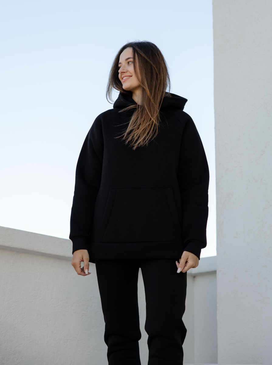 Стильний костюм виконаний зі щільної преміальної тканини з начісом, який гарантує тепло та комфорт у холодну пору. Особливістю моделі для дорослих є подвійний капюшон для додаткового затишку, тоді як дитячий варіант має одинарний капюшон. Манжети рукавів та штанів виконані із м'якого матеріалу - рібани, що забезпечує ідеальну посадку.