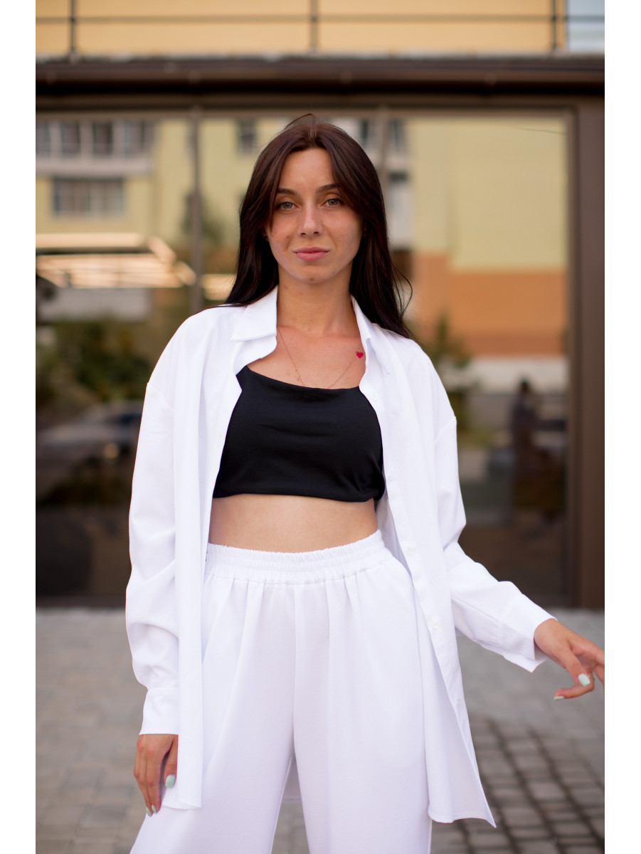 Легкий жіночий костюм Fly - це сорочка та штани палаццо, які виконані з льону стрейч. Тканина чудово вбирає вологу, що дозволяє зберігати відчуття свіжості та комфорту навіть у спекотну погоду. Подовжена сорочка на ґудзиках ідеально поєднується з будь-яким топом або майкою. Штани палаццо високої посадки з еластичною резинкою на поясі не перетискають шкіру. Їх можна носити з кросівками, босоніжками, кедами чи підборами