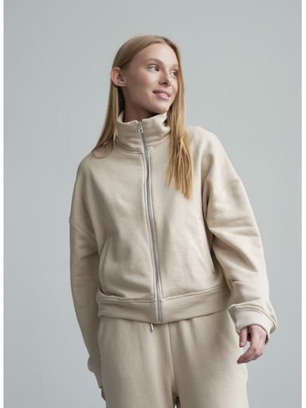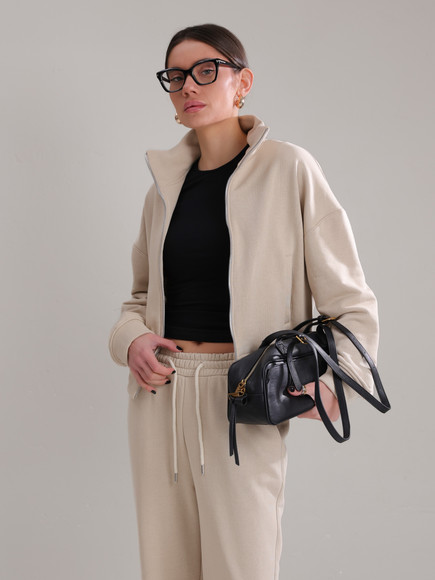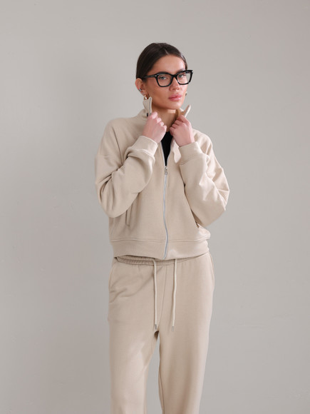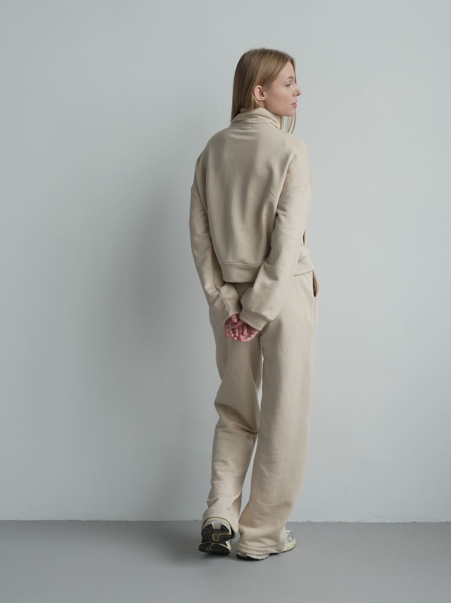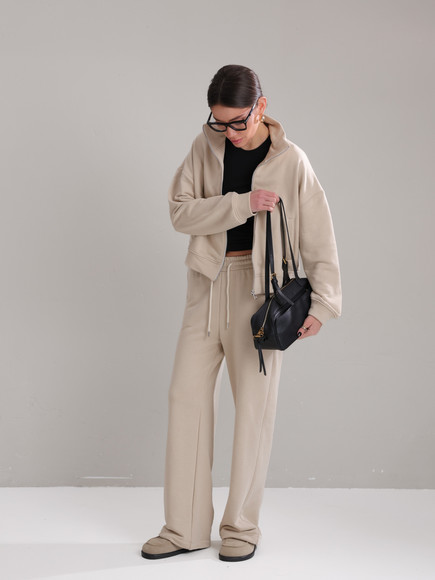 Модель складається з джемпера зі стійкою та кишенями-листочками і прямими штанами середньої посадки із затяжками по низу для створення різних образів.