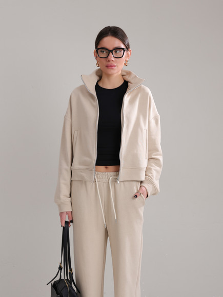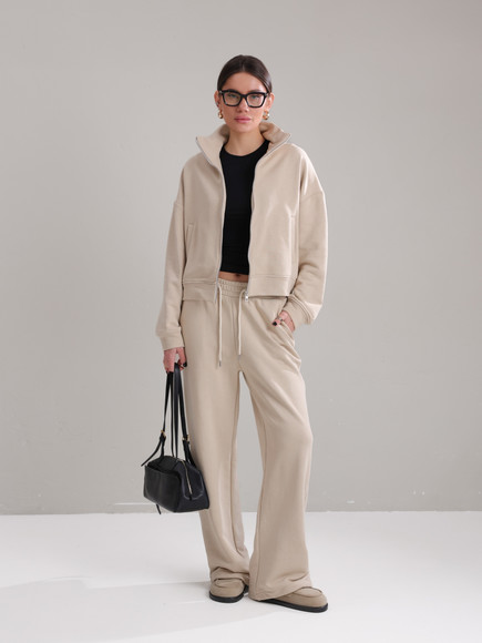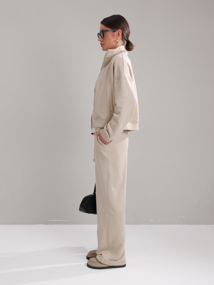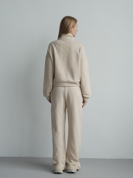 Модель складається з джемпера зі стійкою та кишенями-листочками і прямими штанами середньої посадки із затяжками по низу для створення різних образів.