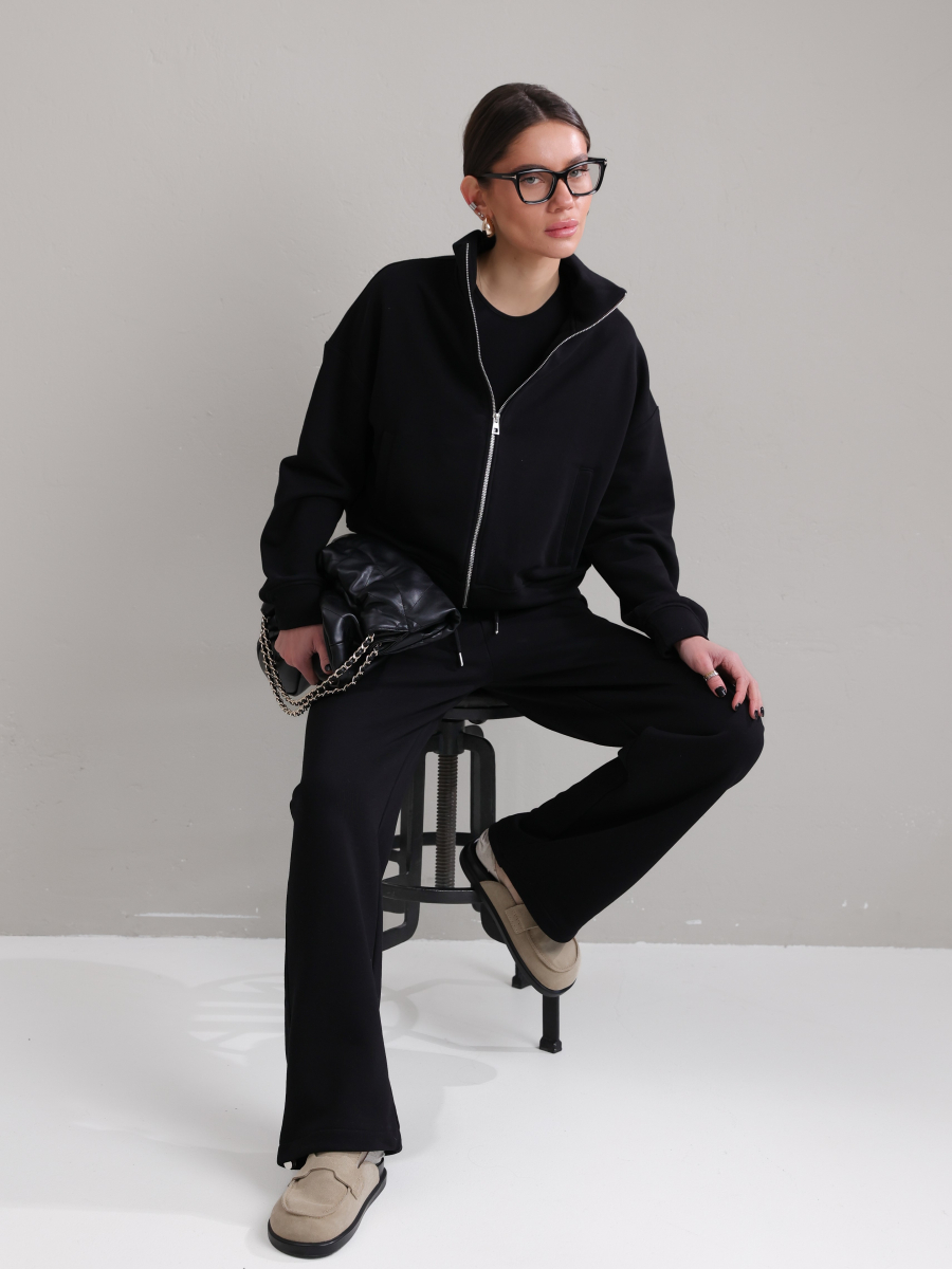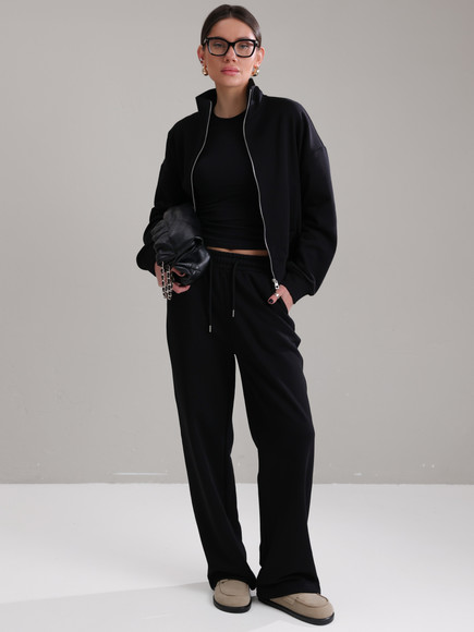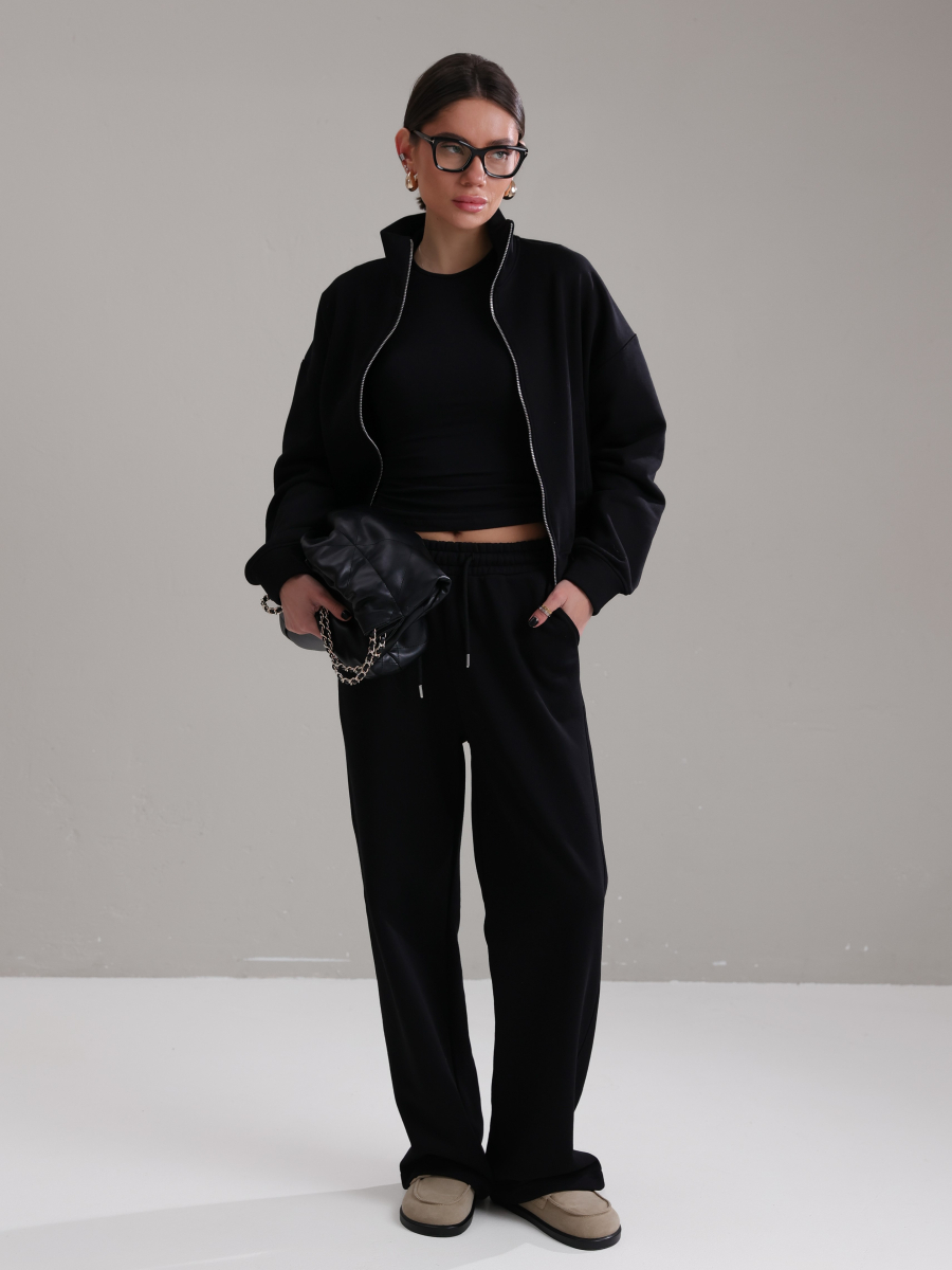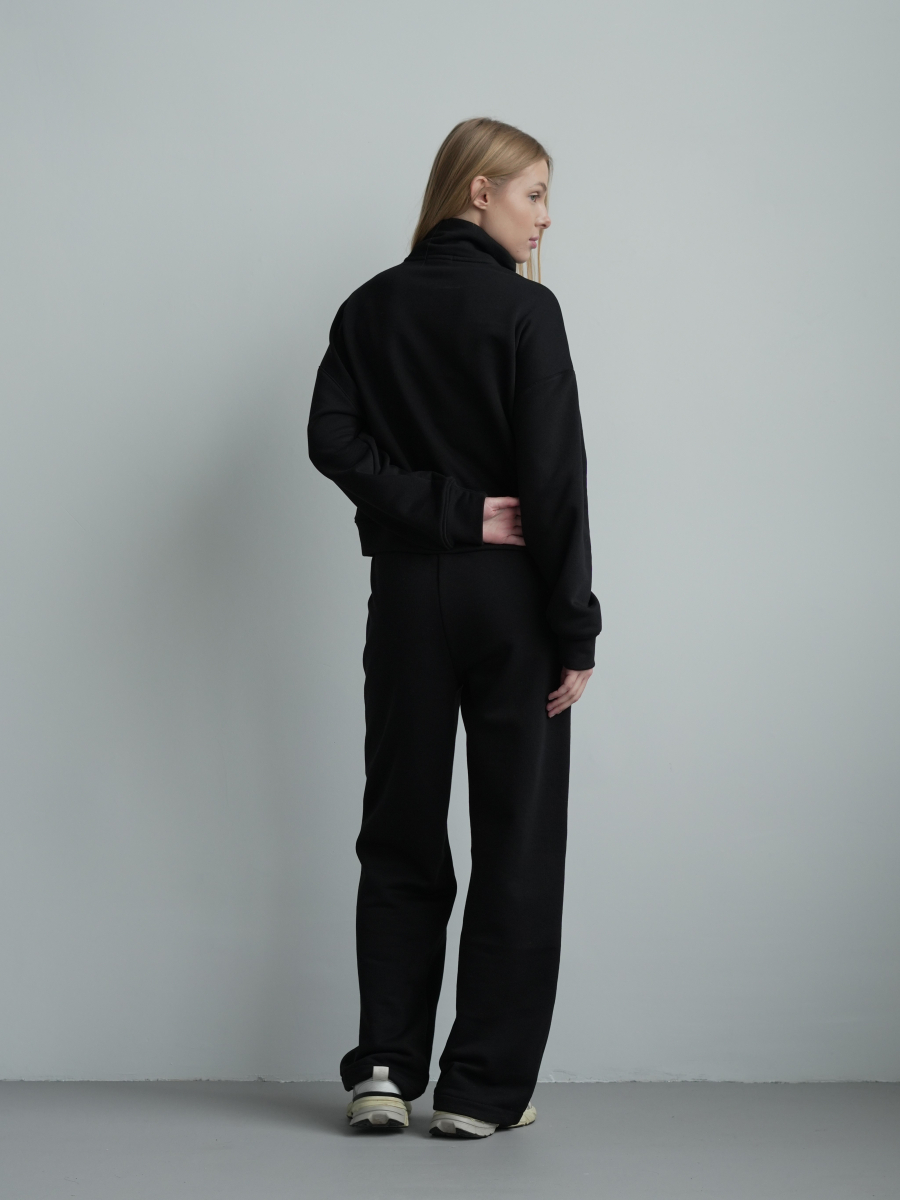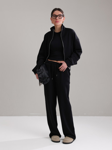Модель складається з джемпера зі стійкою та кишенями-листочками і прямими штанами середньої посадки із затяжками по низу для створення різних образів.