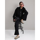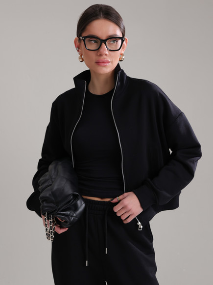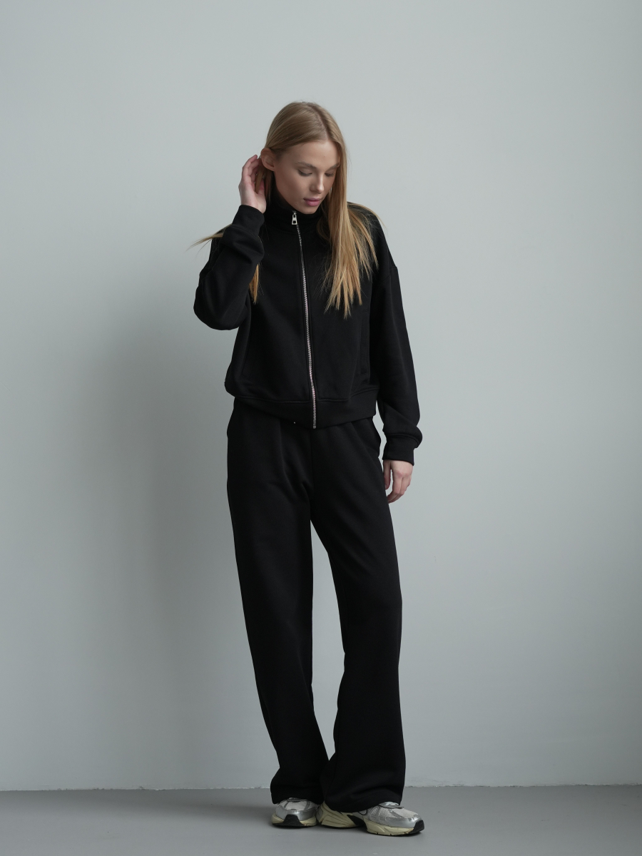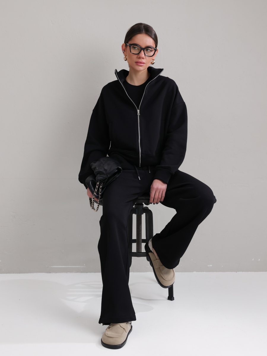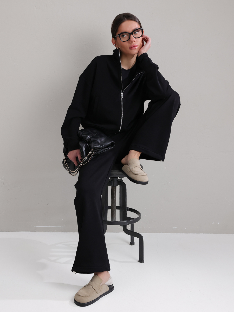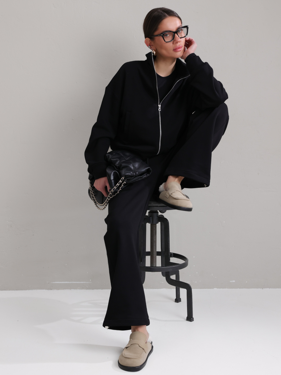Модель складається з джемпера зі стійкою та кишенями-листочками і прямими штанами середньої посадки із затяжками по низу для створення різних образів.