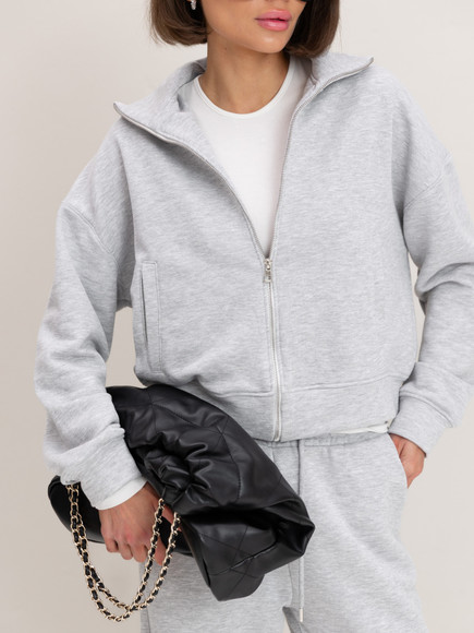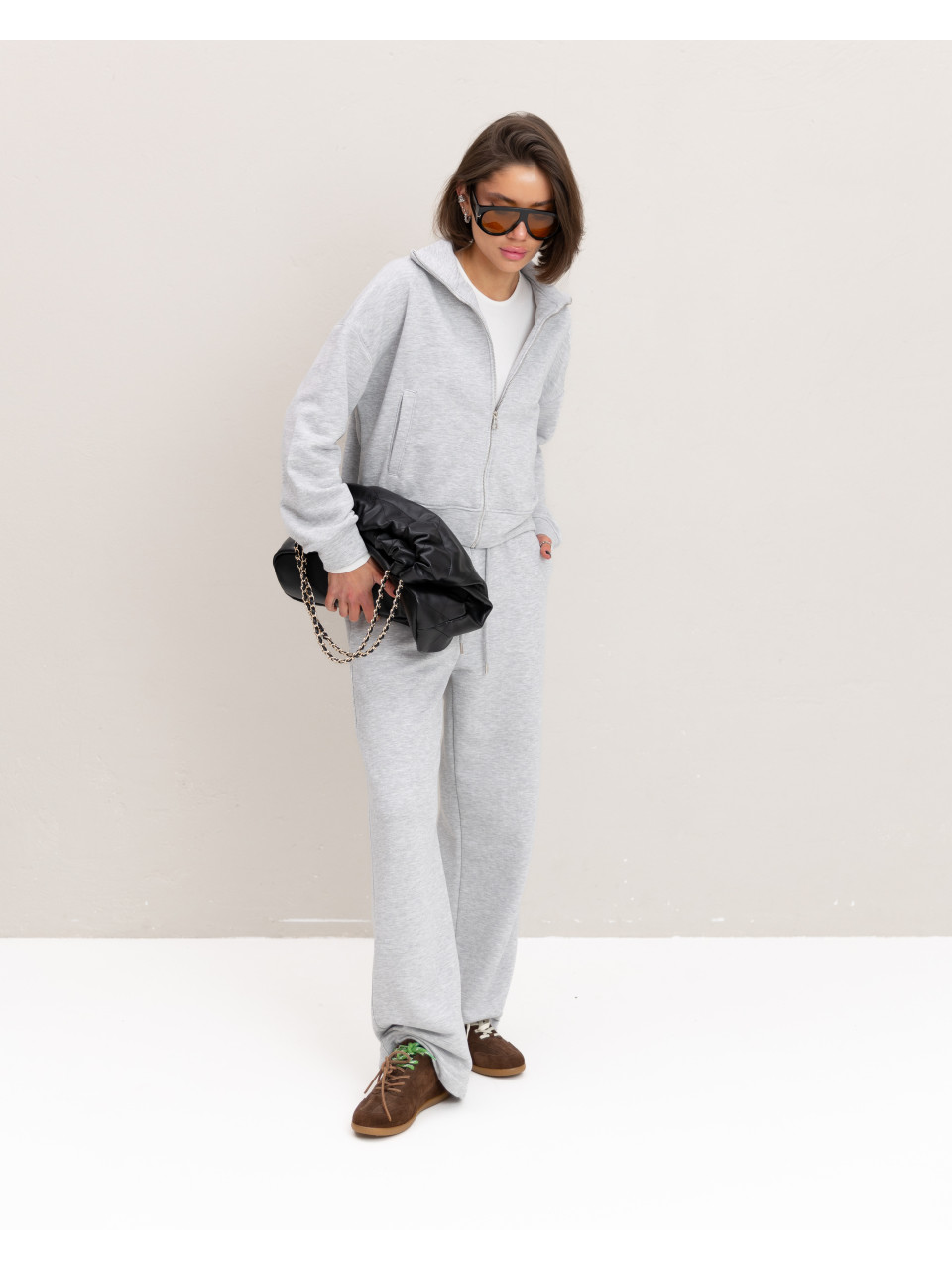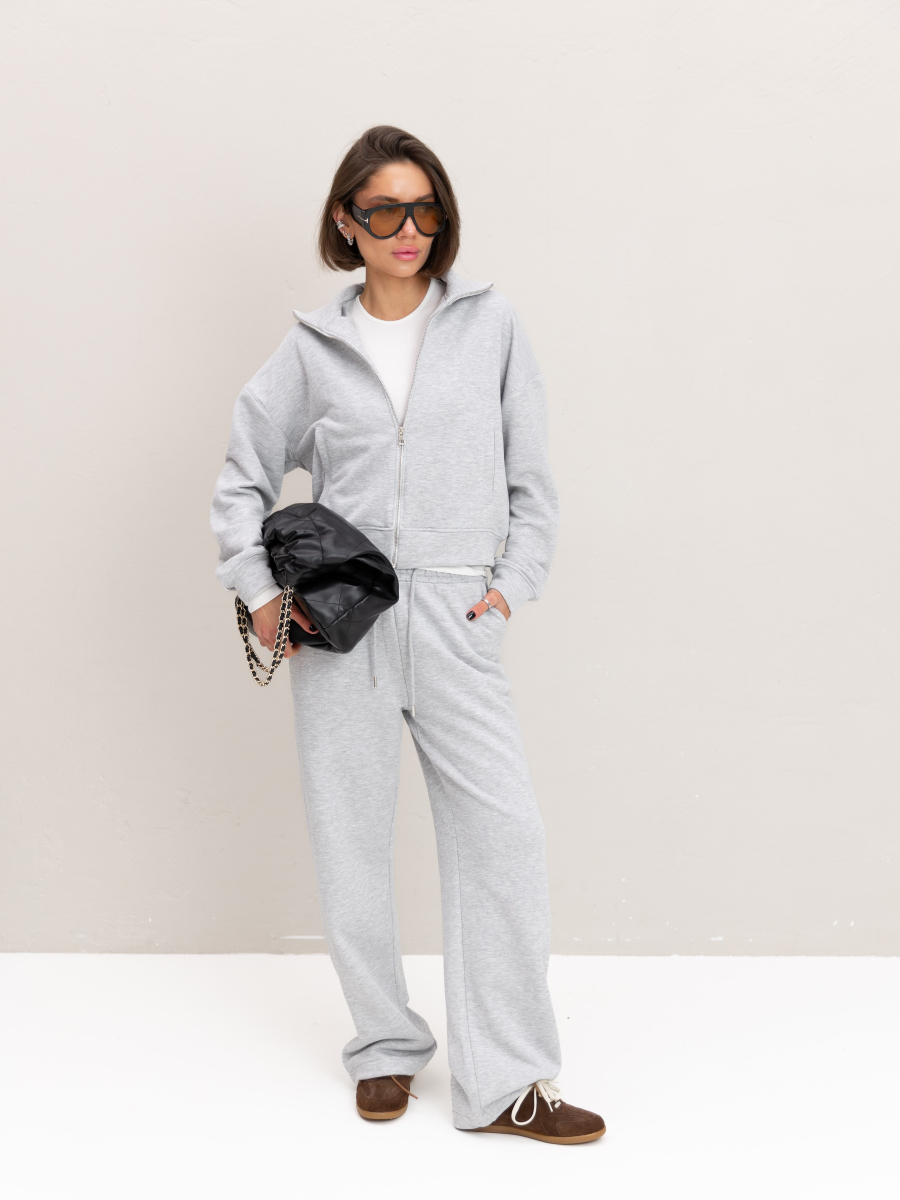 Модель складається з джемпера зі стійкою та кишенями-листочками і прямими штанами середньої посадки із затяжками по низу для створення різних образів.