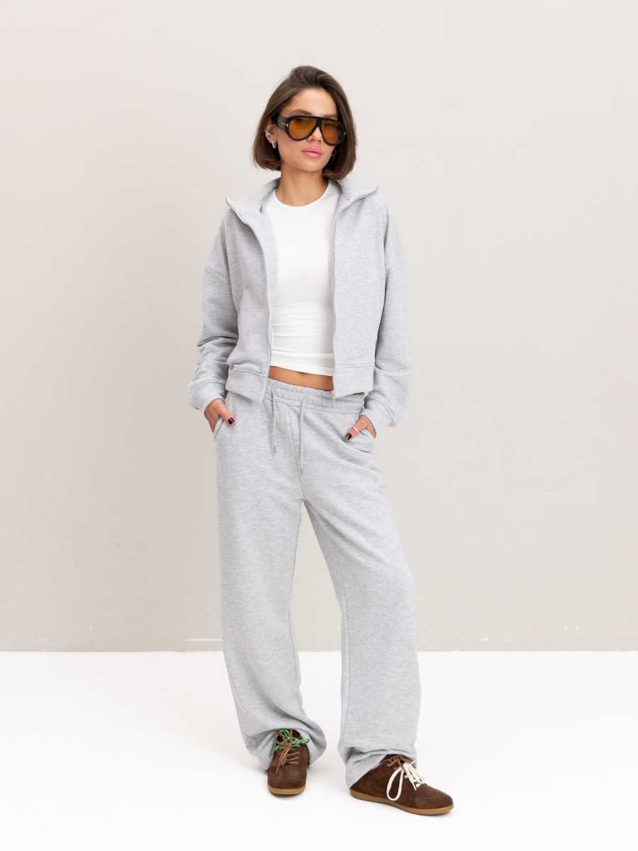 Виконаний із тринитки зі шліфованим покриттям зовні та щільним переплетенням зсередини, завдяки чому костюм тримає форму, не витягується на колінах, виглядає охайно навіть після цілого дня в русі.