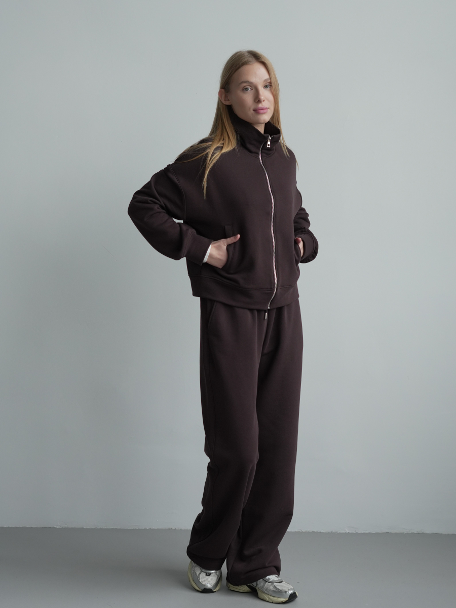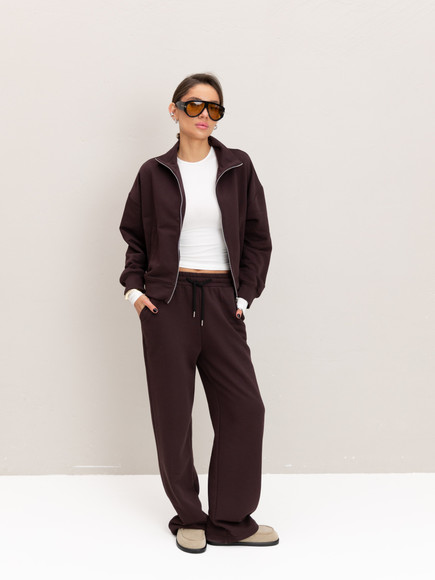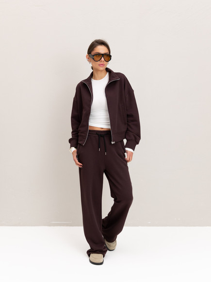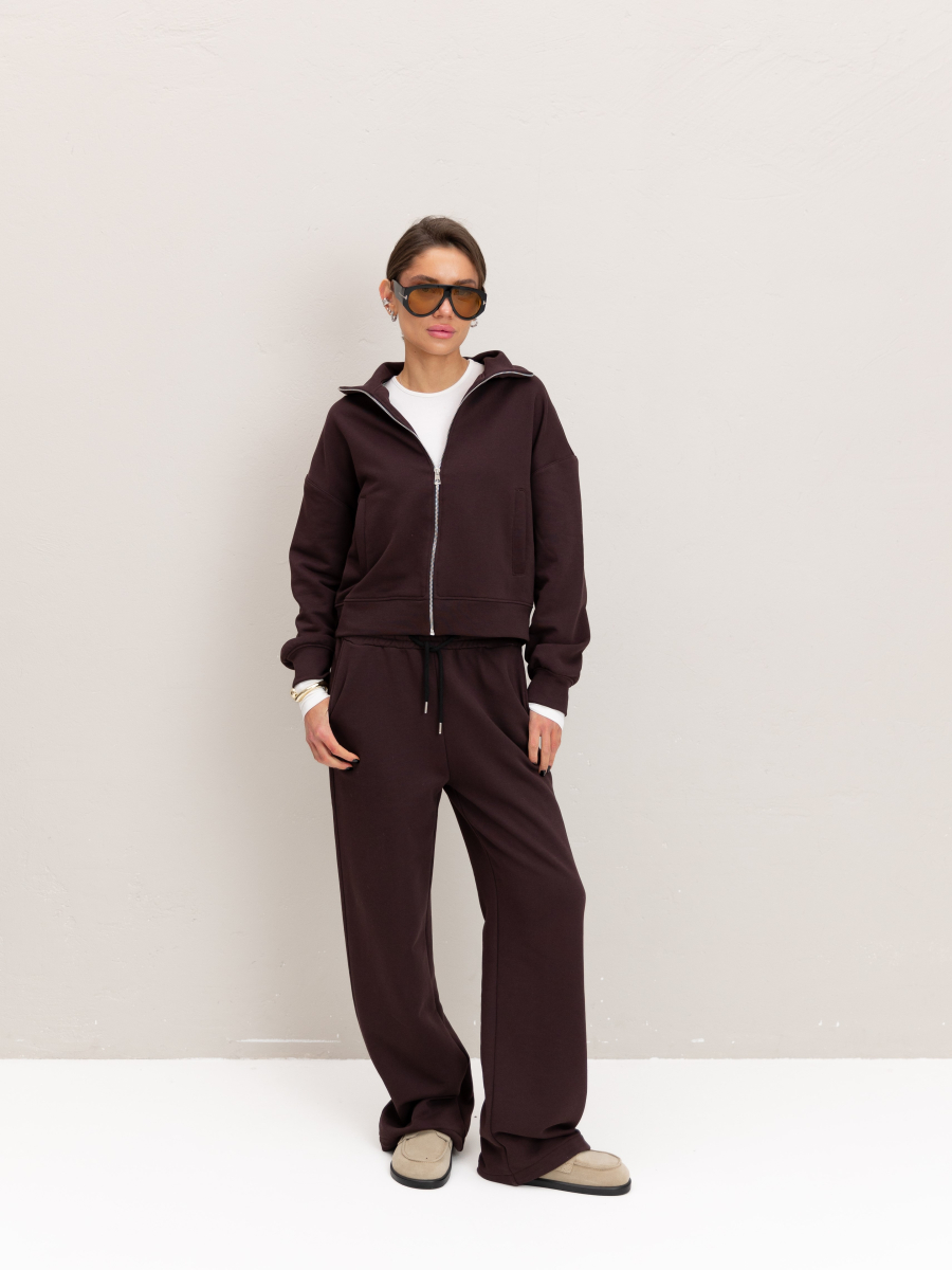 Модель складається з джемпера зі стійкою та кишенями-листочками і прямими штанами середньої посадки із затяжками по низу для створення різних образів.
