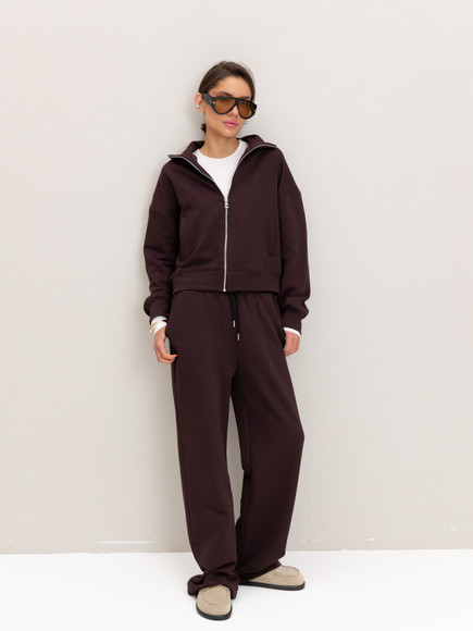 Модель складається з джемпера зі стійкою та кишенями-листочками і прямими штанами середньої посадки із затяжками по низу для створення різних образів.
