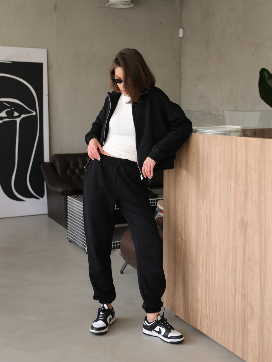 Стильний та комфортний костюм, що поєднує сучасний мінімалізм і практичність. Бомбер зі стійкою додає образу чіткості та характеру, підкреслюючи лінію плечей і створюючи акуратний силует. Зручна застібка та продуманий крій забезпечують комфорт у щоденному носінні, а еластичні манжети додають завершеності.