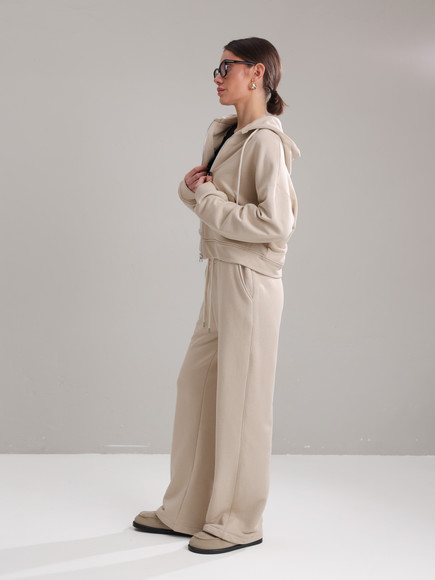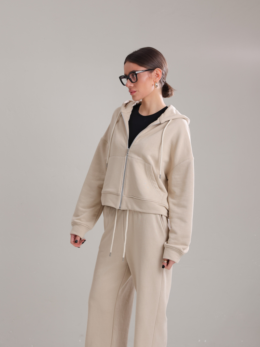 Жіночий костюм у повсякденному стилі - ідеальний баланс комфорту та трендовості. Худі з капюшоном доповнене шнурками. Прямі штани з затяжками можна трансформувати: залишити як прямі штани або стягнути затяжки та створити ефект джогерів.