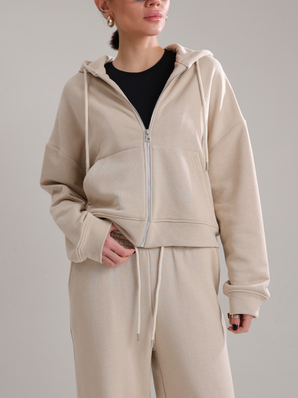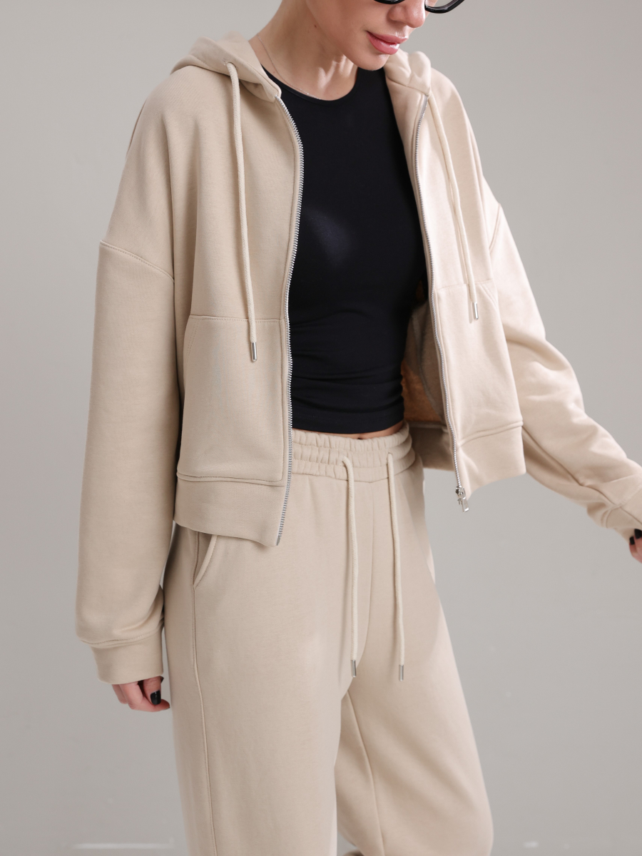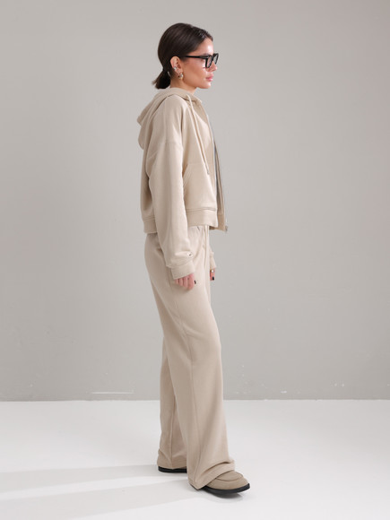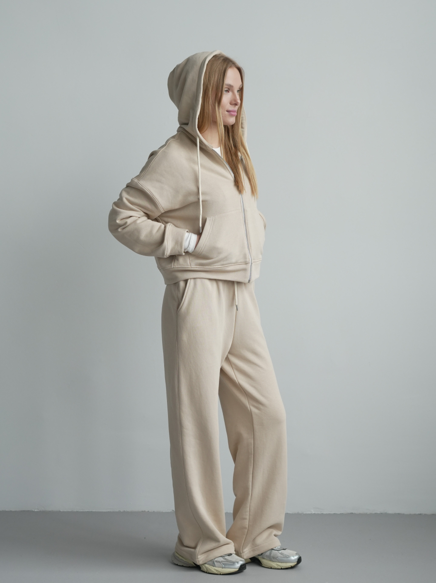 Жіночий костюм у повсякденному стилі - ідеальний баланс комфорту та трендовості. Худі з капюшоном доповнене шнурками. Прямі штани з затяжками можна трансформувати: залишити як прямі штани або стягнути затяжки та створити ефект джогерів.