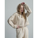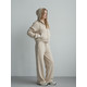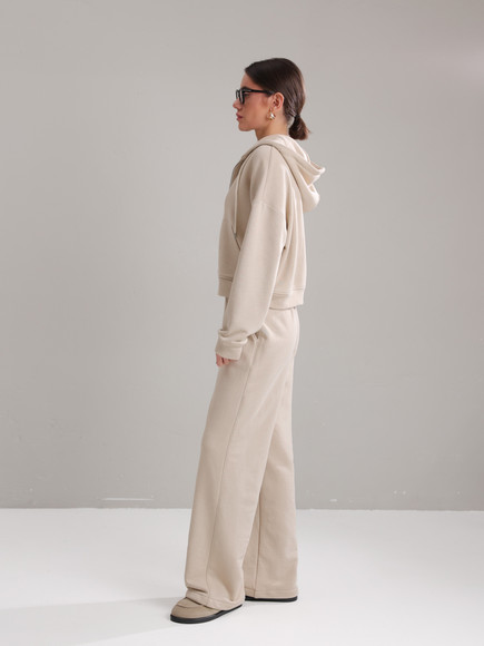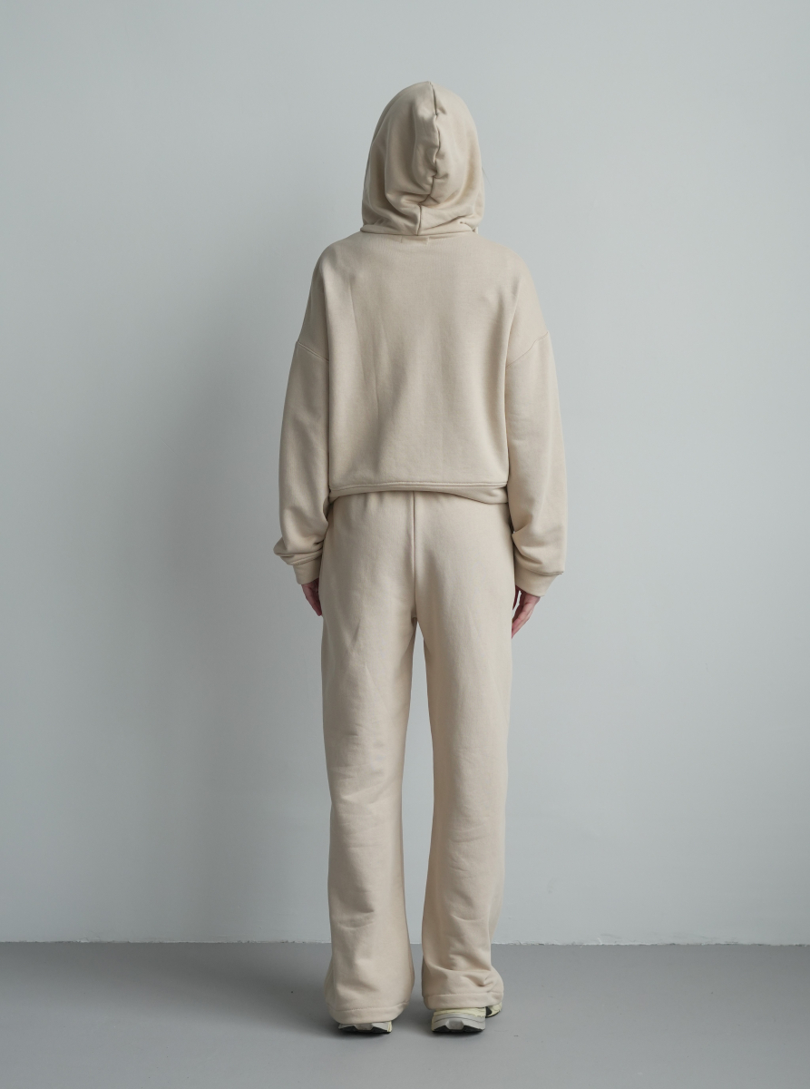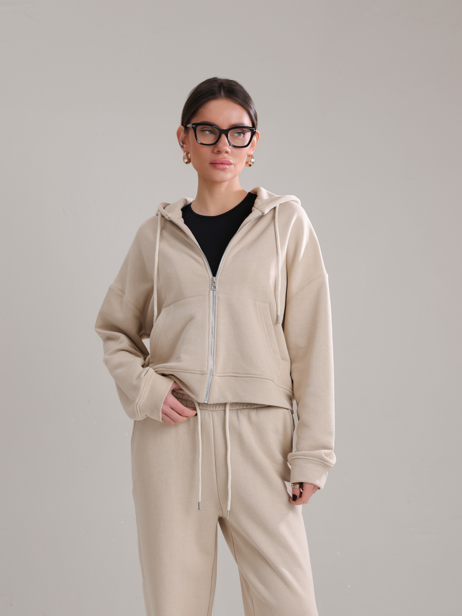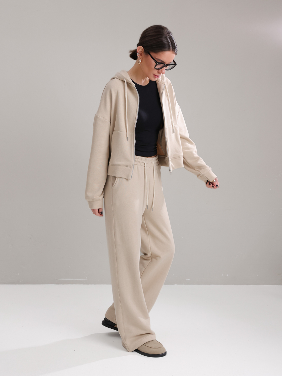 Жіночий костюм у повсякденному стилі - ідеальний баланс комфорту та трендовості. Худі з капюшоном доповнене шнурками. Прямі штани з затяжками можна трансформувати: залишити як прямі штани або стягнути затяжки та створити ефект джогерів.
