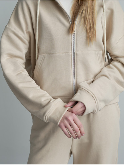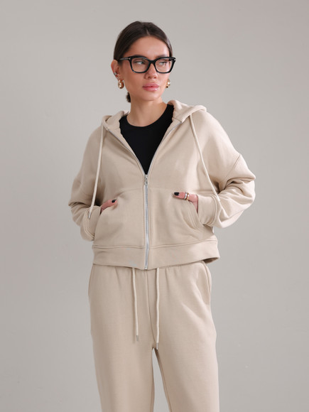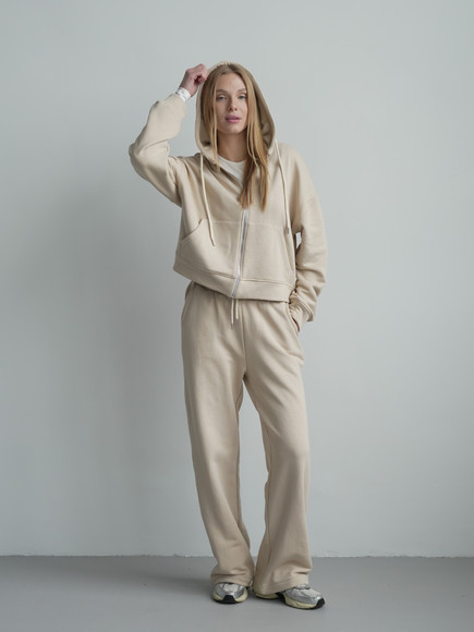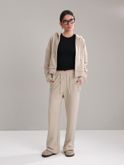 Жіночий костюм у повсякденному стилі - ідеальний баланс комфорту та трендовості. Худі з капюшоном доповнене шнурками. Прямі штани з затяжками можна трансформувати: залишити як прямі штани або стягнути затяжки та створити ефект джогерів.
