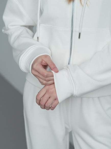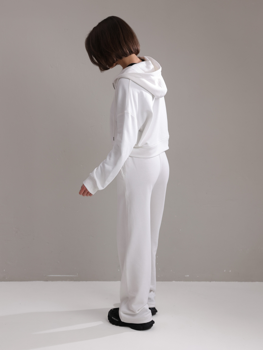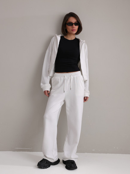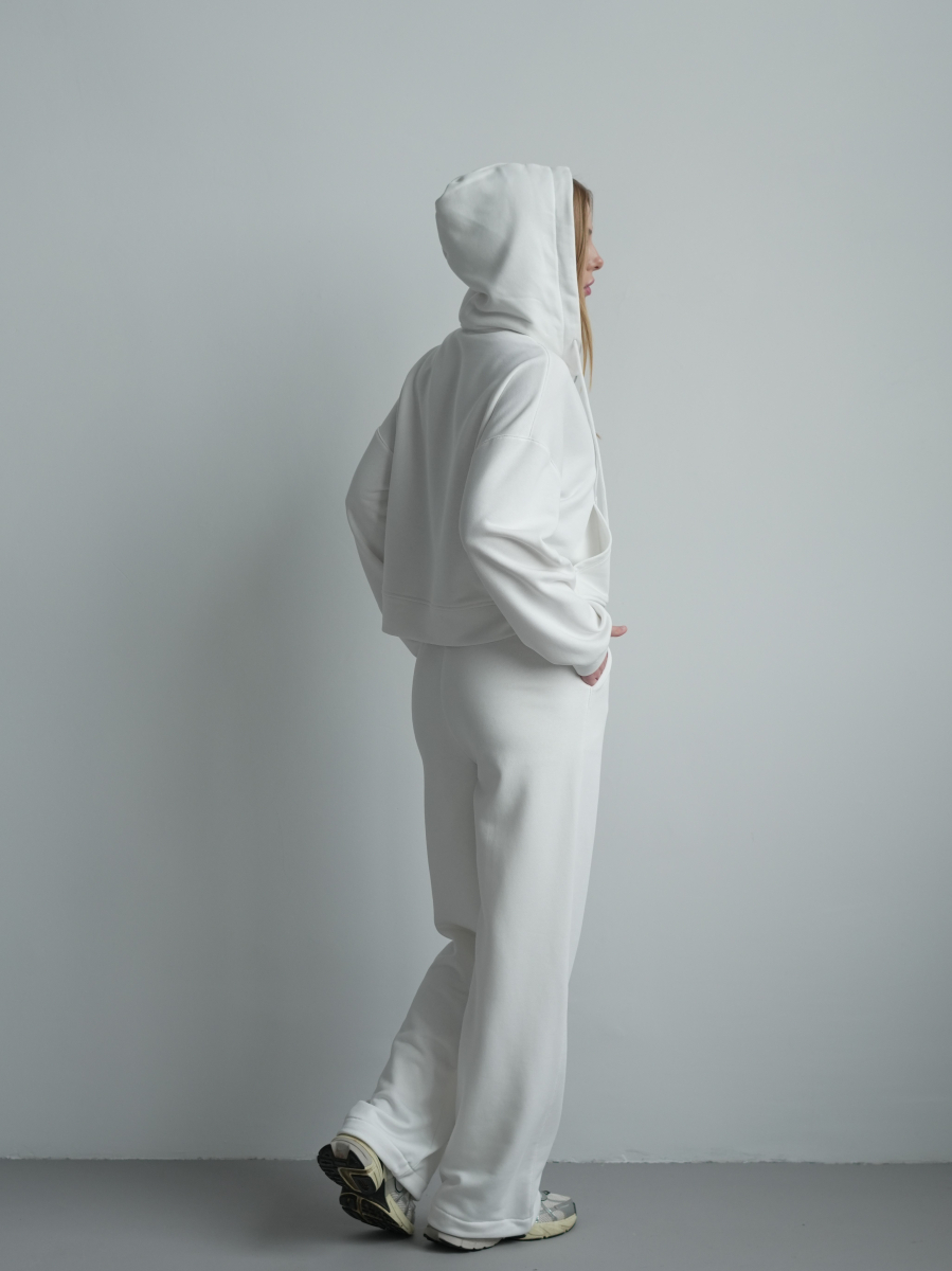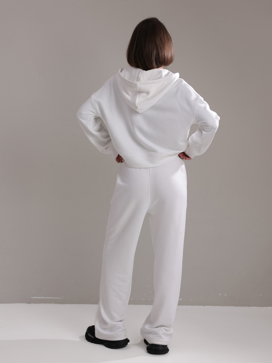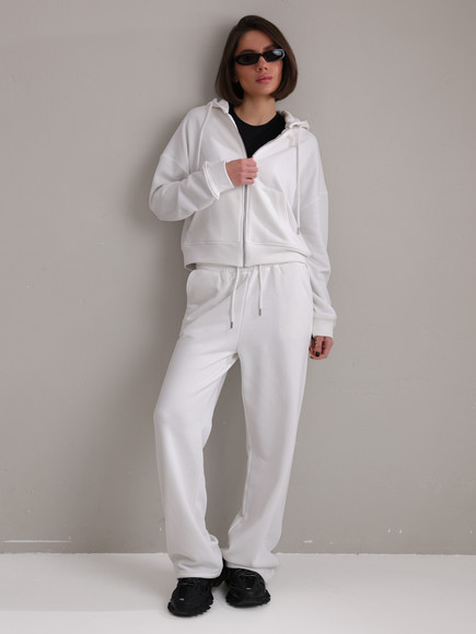 Жіночий костюм у повсякденному стилі - ідеальний баланс комфорту та трендовості. Худі з капюшоном доповнене шнурками. Прямі штани з затяжками можна трансформувати: залишити як прямі штани або стягнути затяжки та створити ефект джогерів.