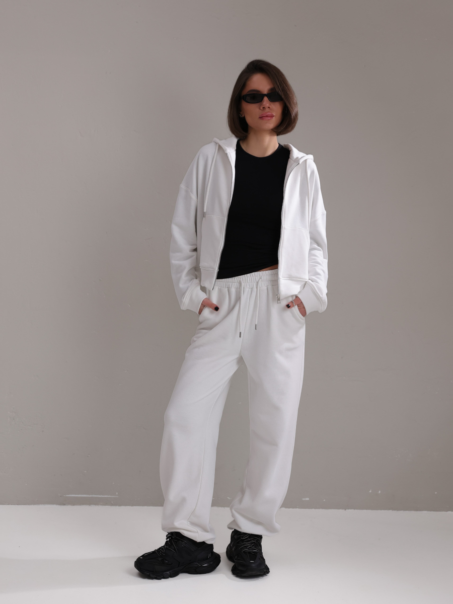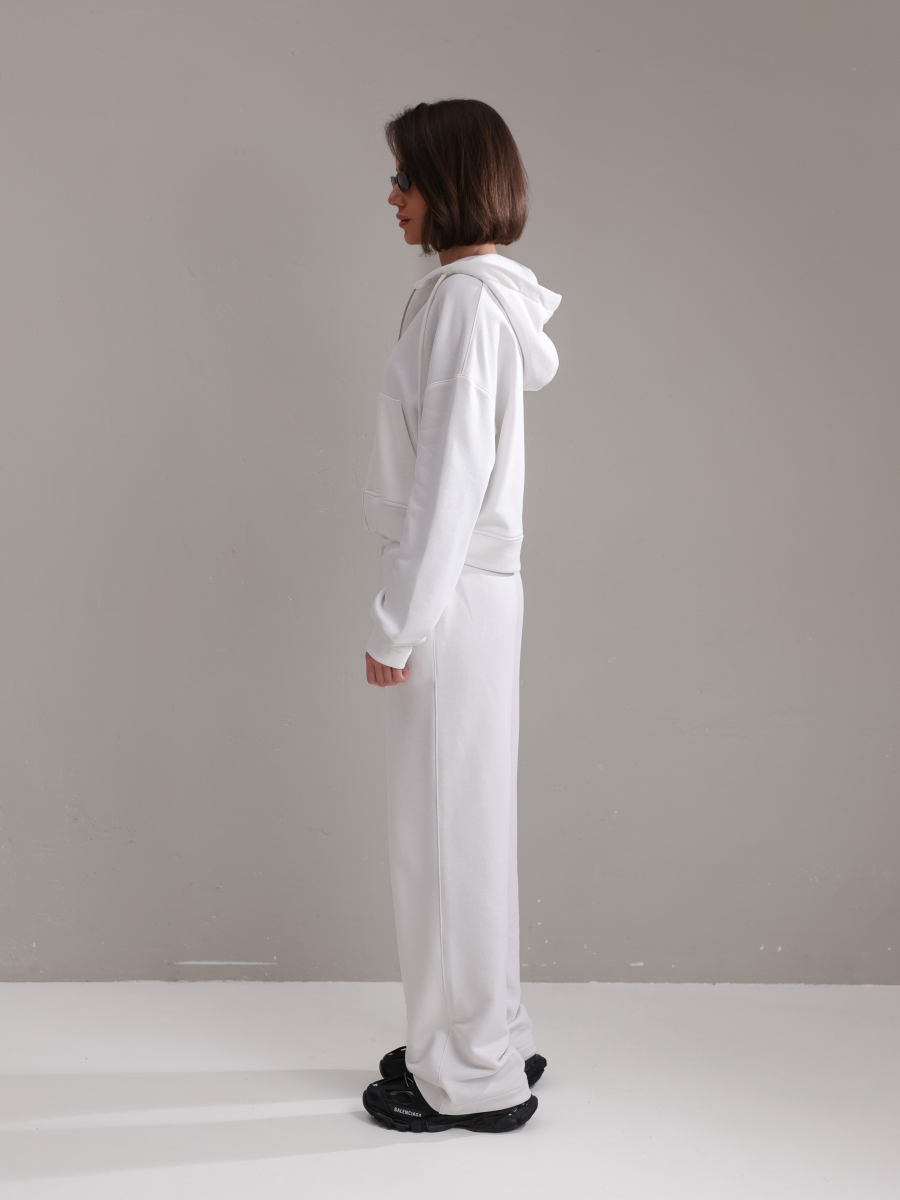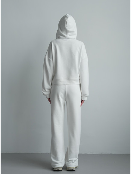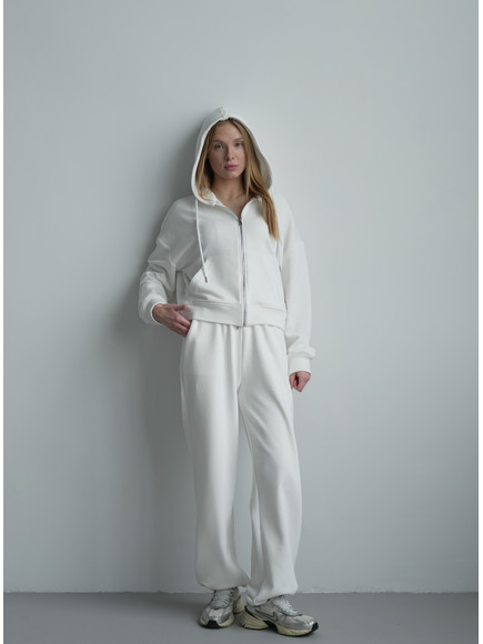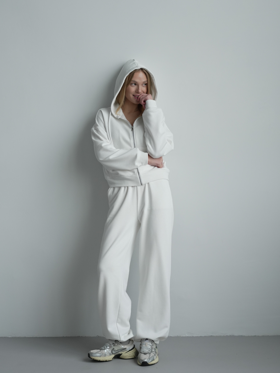 Жіночий костюм у повсякденному стилі - ідеальний баланс комфорту та трендовості. Худі з капюшоном доповнене шнурками. Прямі штани з затяжками можна трансформувати: залишити як прямі штани або стягнути затяжки та створити ефект джогерів.