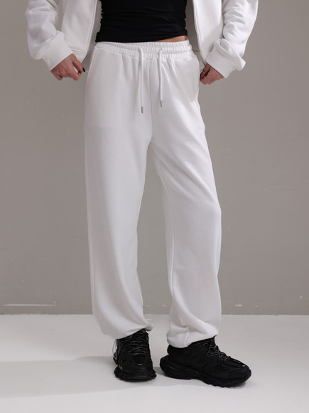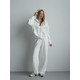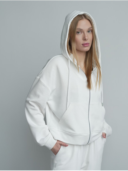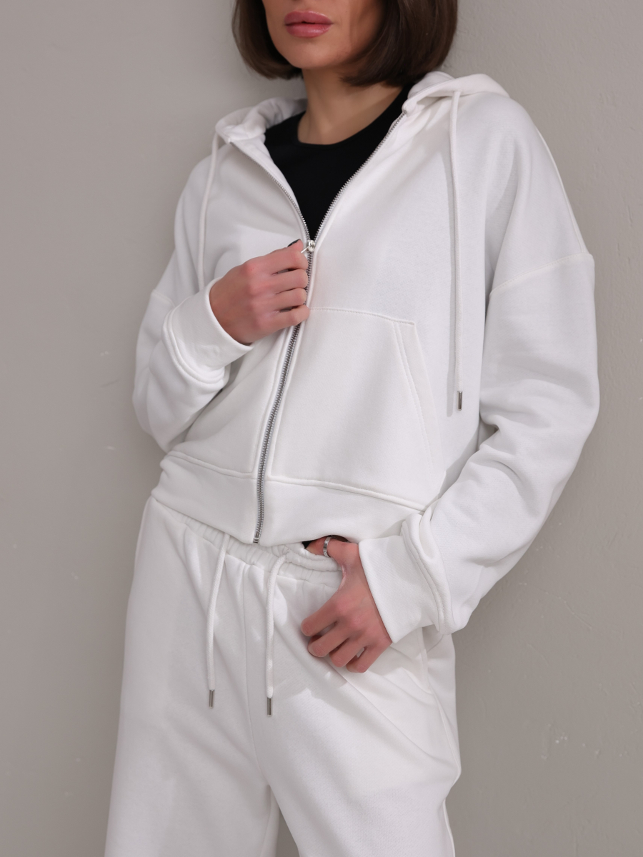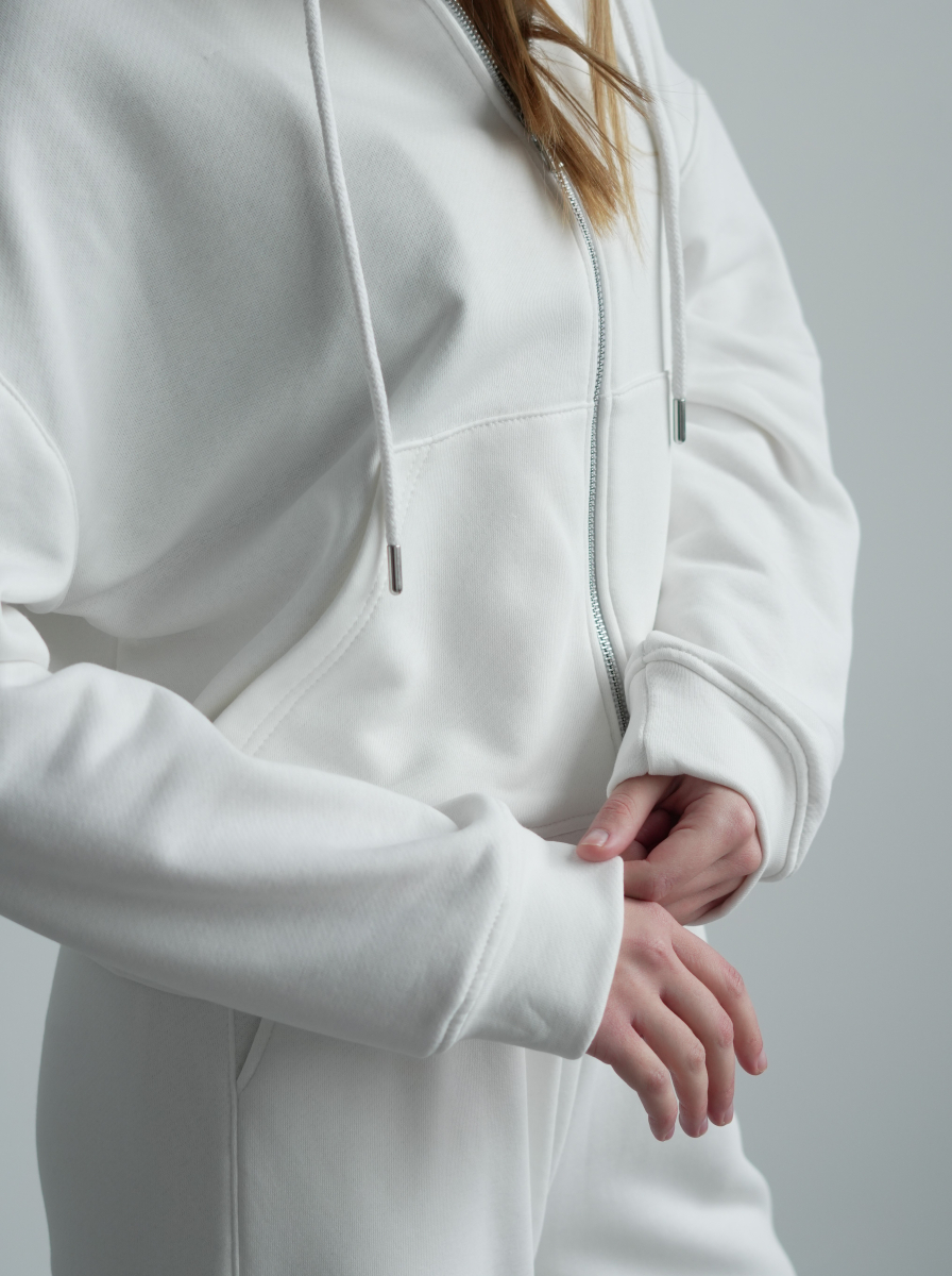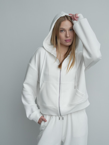 Жіночий костюм у повсякденному стилі - ідеальний баланс комфорту та трендовості. Худі з капюшоном доповнене шнурками. Прямі штани з затяжками можна трансформувати: залишити як прямі штани або стягнути затяжки та створити ефект джогерів.